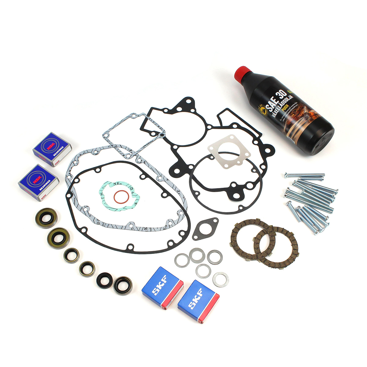 Tips att komplettera med:Lagerrullar 11098Låsringsats 13663Dragbult kopplingVevaxelStålskivor kopplingInnehåll:Lager 11941 och 10228 NSK/SKF 2 av varjePackboxsats 10218Packningssats 10094Olja 29913Lameller 10662Shims 11364Skruvsats 17857