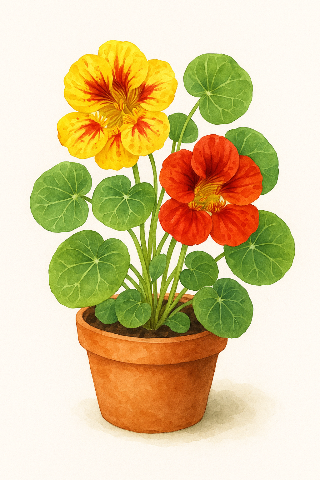 Tropaeolum majus’Ice Cream Sundae’ är en dvärgvariant av blomsterkrasse (indiankrasse), med en buskig växtsätt som når cirka 20–35 cm i höjd och bredd. Den är särskilt väl lämpad för krukor, amplar och rabatter. Blommorna är färgstarka och föränderligt läckra — de börjar i klargult och övergår successivt till djup rött, ofta med prickar eller fläckar, och framstår nästan som ett kulinariskt konstverk. Plantan är snabbväxande och rikblommande, med blomning från juni till september i tempererade klimatzoner. Alla delar av växten är ätbara — både blommor, blad och fröblad. De har en pepprig, senapsliknande smak och passar fint i sallader, som garnering eller torkade som ett sätt att ersätta kapris.Illustration: Sneckenström
