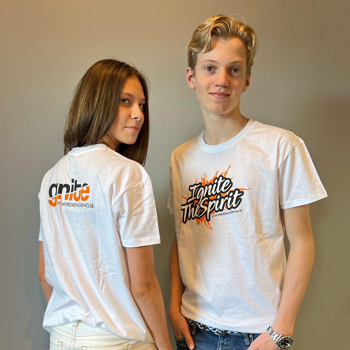 T-shirt, Ignite the Spirit Vår egen snygga T-shirt för alla mopedälskare! T-shirten är i unisex-modell och har trycket Ignite The Spirit på bröstet, samt vår IGNITE-logga på ryggen. Den är tillverkad i en skön kvalitet i 100% bomull.Tröjan finns i tre färger: - Mörk grå- Aquablå- VitStorlekar: S, M, L och XL
