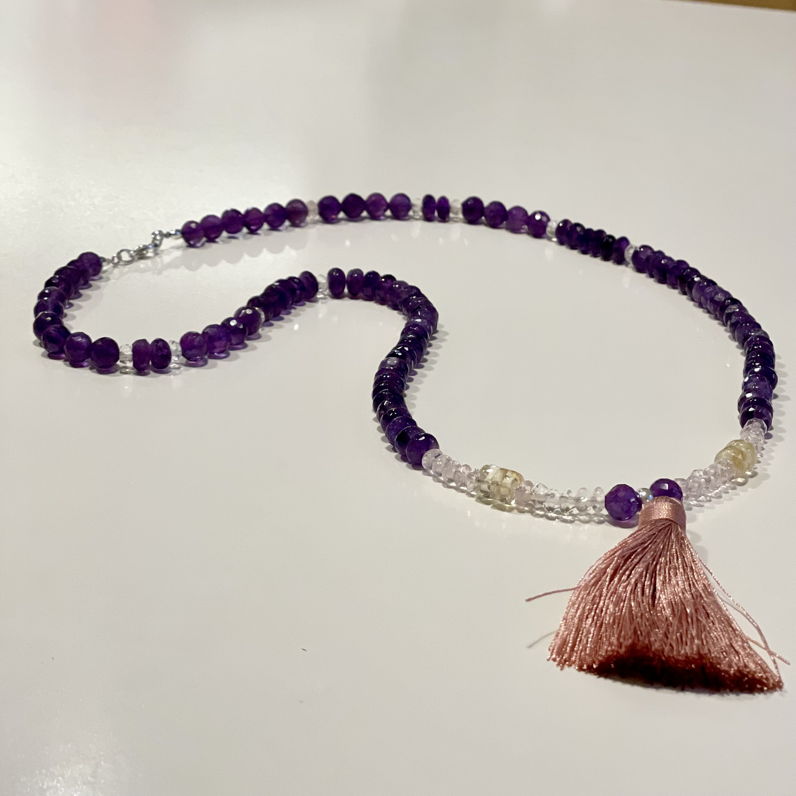 Mala-inspirerat halsband med facettslipad ametist, citrin och rosenkvarts. Det här halsbandet är skapat med intentionen och kristallernas energifrekvens att hjälpa bäraren att komma i kontakt med sitt högre jag, främja självkärlek, balansera, jorda och föra in mer glädje.Kristallernas kombination främjar dessa syften men även intentionen och skapandeprocessen bakom detta smycke har en speciellt stark energifrekvens. Detta smycke är för dig som vill få mer balans i ditt liv och känna en lättare, mer kärleksfull och glädjefull energi.