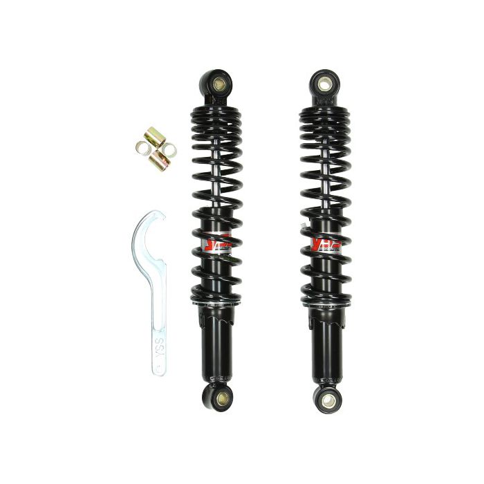 Utförande:RD220-350P-01-88R= Rear twin shockD= Double tube hydraulic shock220= 22mm kolv, 10mm kolvstång350= Längd ccP= Fjäderförspänning i fasta steg01= Fabrikens spec.88= färg svart stötdämpare / svart fjäderSvarta. Ställbara i fem steg. Reducering för 10/12 mm hål uppe och nere medföljer samt haknyckel för inställning.Notera att detta är en riktig stöddämpare så fjädern är något mjukare än enklare modeller.Fästen:Uppe: Diameter 33mm, bredd, 20,2 mmNere: Diameter 28 mm, bredd 20,5 mm Notera att det är fjäderns förspänning som är ställbar, inte längden.