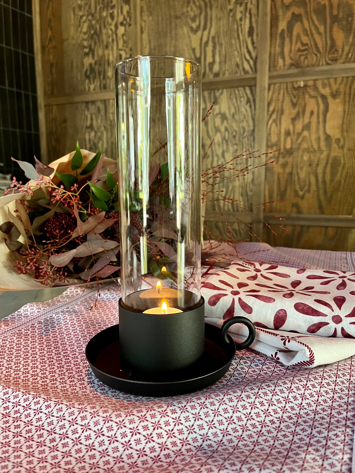 Stilren stormlykta i svart smide med glascylinder som skyddar lågan och sprider ett mjukt sken. Passar både värmeljus och kronljus.Höjd: 25 cm.Tillverkad i Polen av Spegels Hemslöjd.