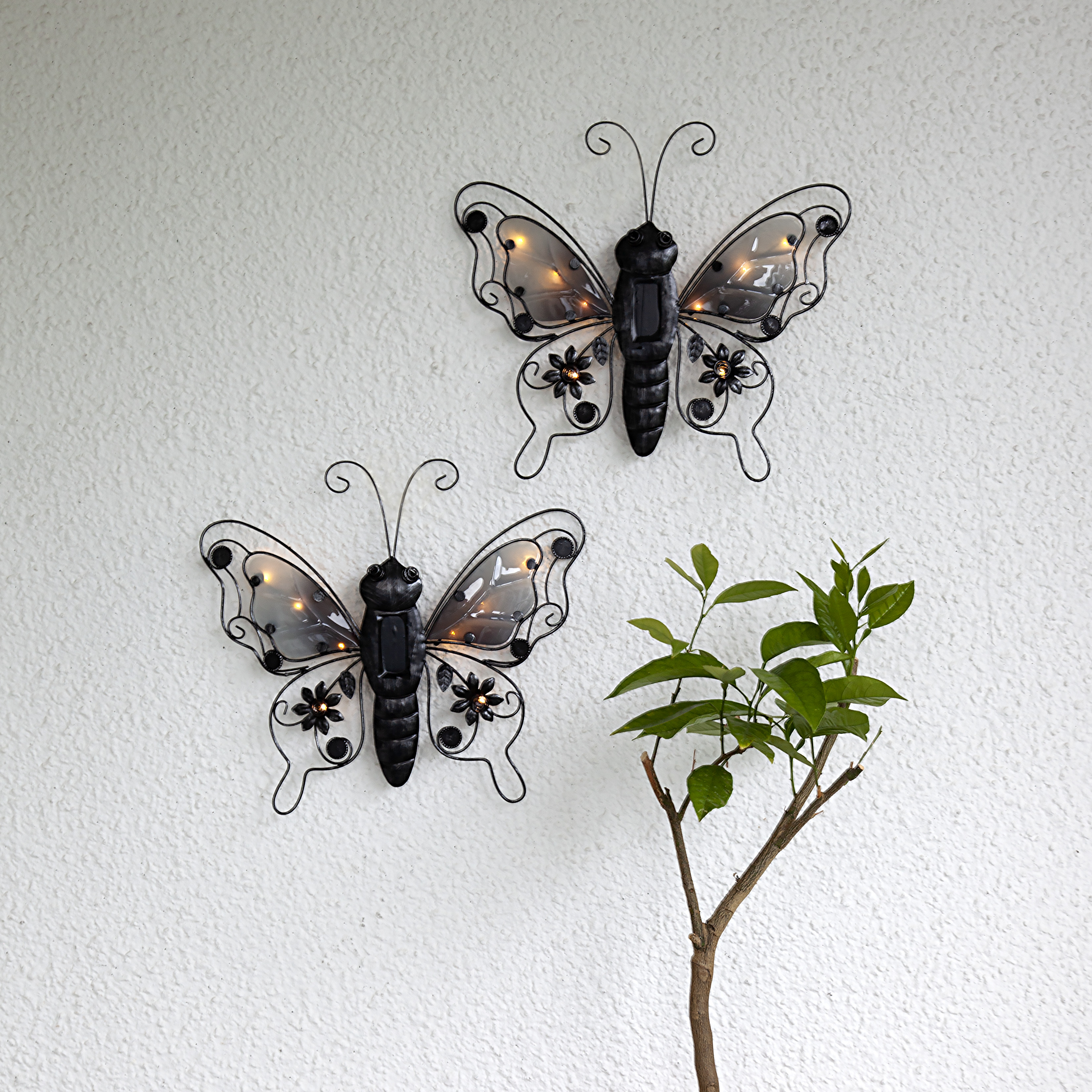Beställningsvara.Solcellsdriven väggdekoration i form av en fjäril som är gjord i metall. Lyser i mörkret med åtta ljuspunkter. Priset avser 1 styck