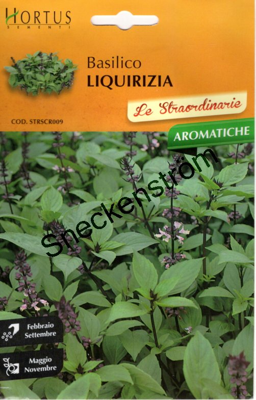>Ocimum basilicum<Lakritsbasilika, även känd som anisbasilika, är en variant av basilika med en mycket liknande smak som lakrits, vilket är där den har fått sitt namn. Den här växten har något spetsiga gröna blad och vita och ljuslila blommor arrangerade på sina typiska spikformade blomställningar. Det är ett intressant val för älskare av ovanliga och aromatiska smaker.