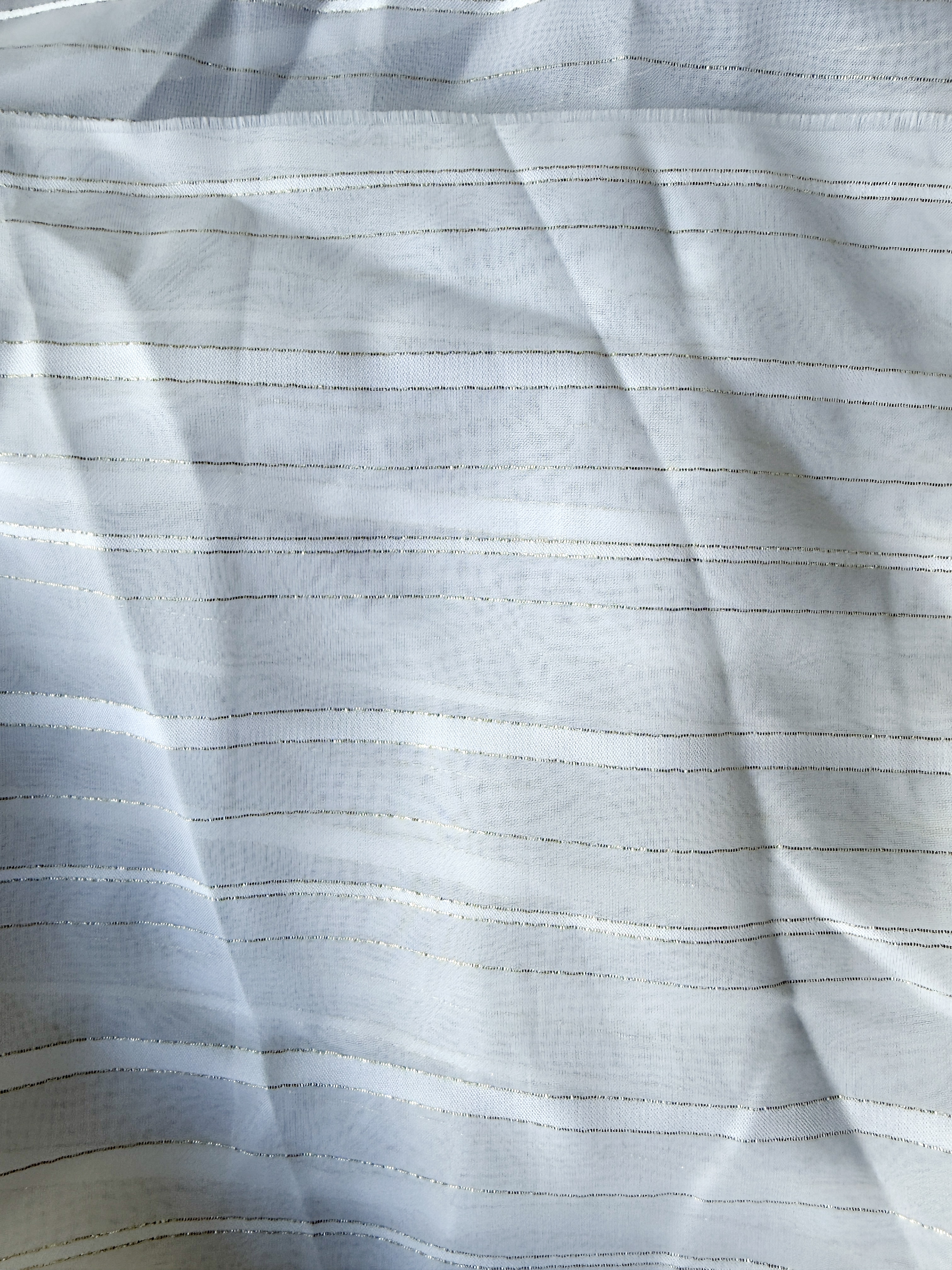 Vintagetyg - fina guldränder på vit chiffong. Bredd 150 cm och längd 1,55 m. Vintagetyg. Snygg vit chiffong med guldiga och vita ränder på tvären av tyget.Priset är för hela biten.Kvalitet: PolyesterBredd: 150 cm.Längd: 1,55 meterTidsperiod: Okänt.Skick: Perfekt, helt oanvänt.