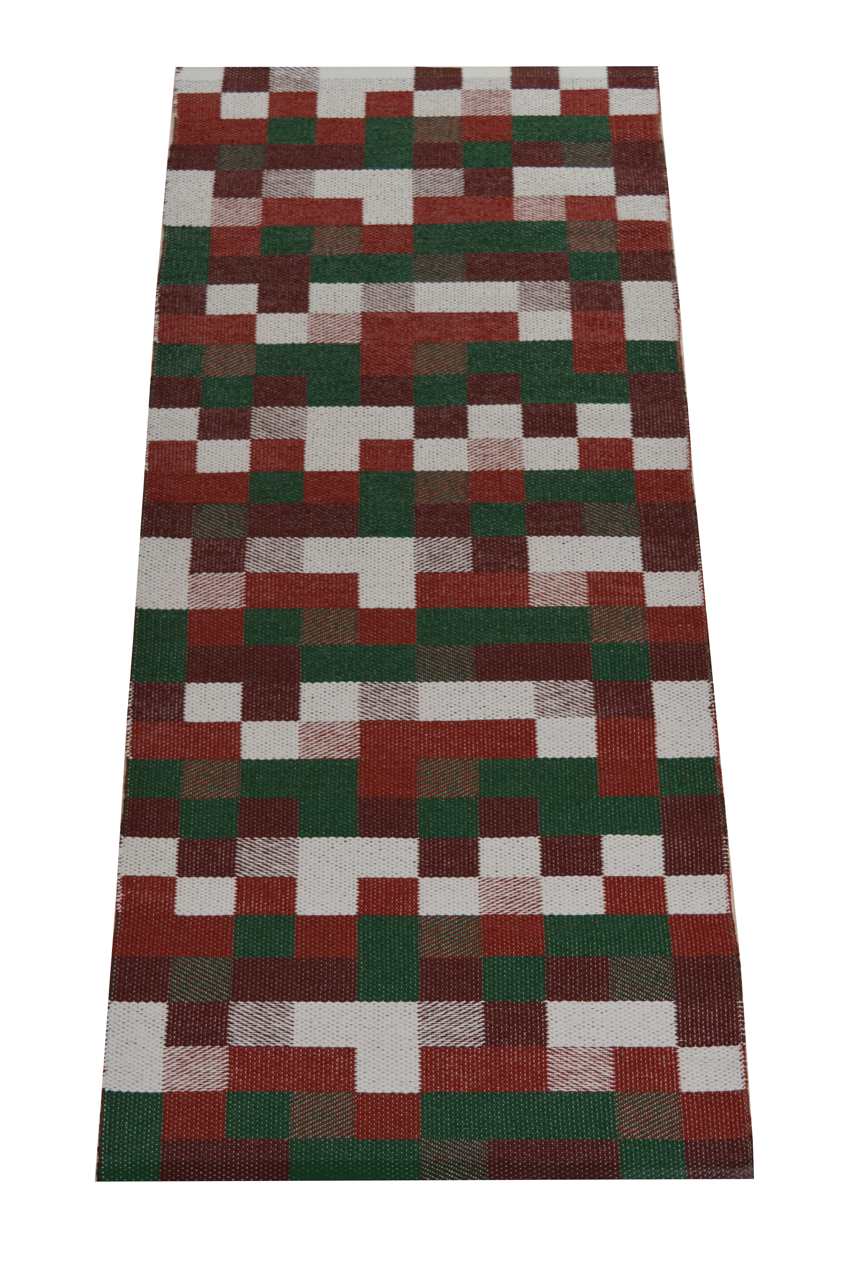Pixel jul är en jacquardvävd plastmatta med ett grafiskt mönster med små kvadrater, som kan liknas vid stora pixlar. Ett mönster som ger en retrokänsla, och även när det gäller färgsättningarna har vi gett mönstret en äldre känsla.Mattans mönster är likadant på båda sidor, och båda sidor kan användas upp.Mattan görs i 70 och 140 cm bredd.Alla plastmattor tillverkar vi i vårt eget väveri, av svensk vinylplast fri från ftalater, tungmetaller och andra farliga eller förbjudna ämnen.