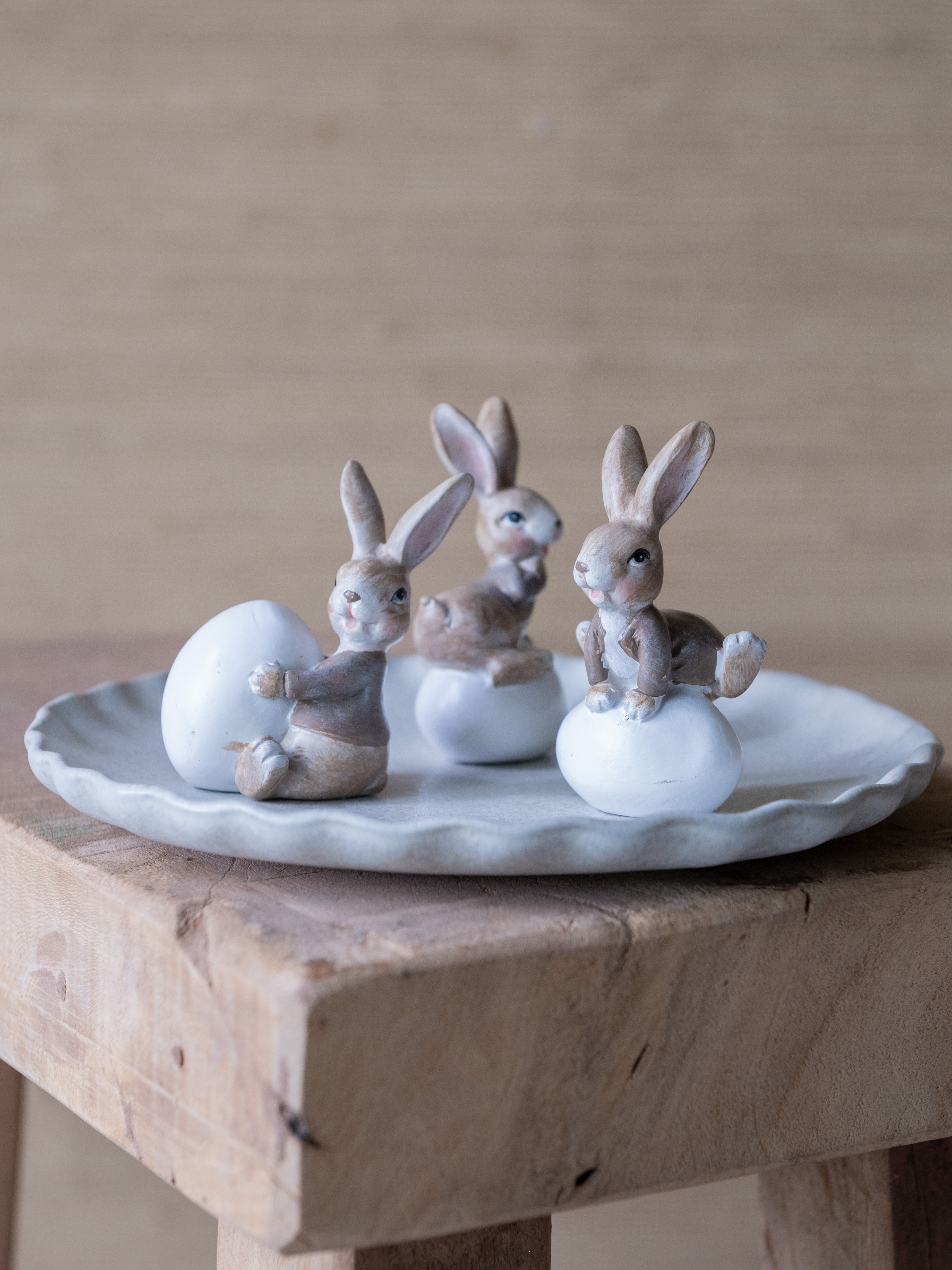 Söta och dekorativa kaniner med ägg. Vackra att pynta med till påsk och även fina som gå bort present. Material: Polyresin4x9 cm Färg: Vit/Brun