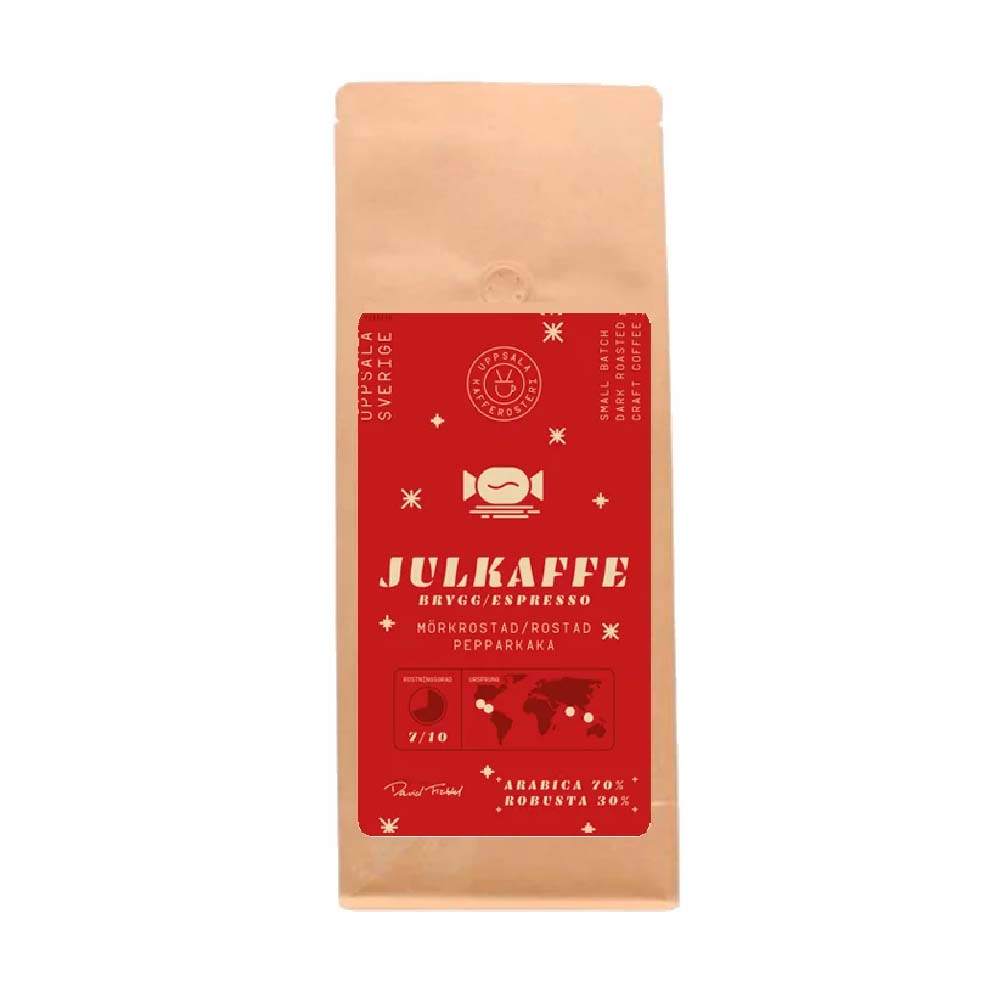 Rostningsdatum 31/10 eller färskare Godast före 31/4 2026God Jul!Vinterns kalla nätter närmar sig stilla, och vi har gjort något att gilla.För en tid när vi vill umgås med nära och kära, och goda saker förtära.Sött,mustigt och härligt, efter middagen är detta begärligt.En kraftfull kopp så fyllig och god, sitter perfekt efter ett julbord.Att njuta av kaffe är roligt och kul, vi på Uppsala kafferosteri önskar er en God jul! Detta är en kaffeblandning som är framtagen för att i alla stunder få en god kopp framför sig!Det är en blandning mellan kaffe från Honduras, Mexiko, Indonesien och Indien, och självklart har vi även tryck på rostningen för att ge kaffet det där lilla extra. Kombinationen av kaffena och rostningen gör att den blir en väldigt kryddig och fylligt kaffe som passar både i bryggaren och som espresso. Med pepparkakan eller efter julbordet behövs något ordentligt men som inte är för tungt. God Jul önskar vi på Uppsala kafferosteri!