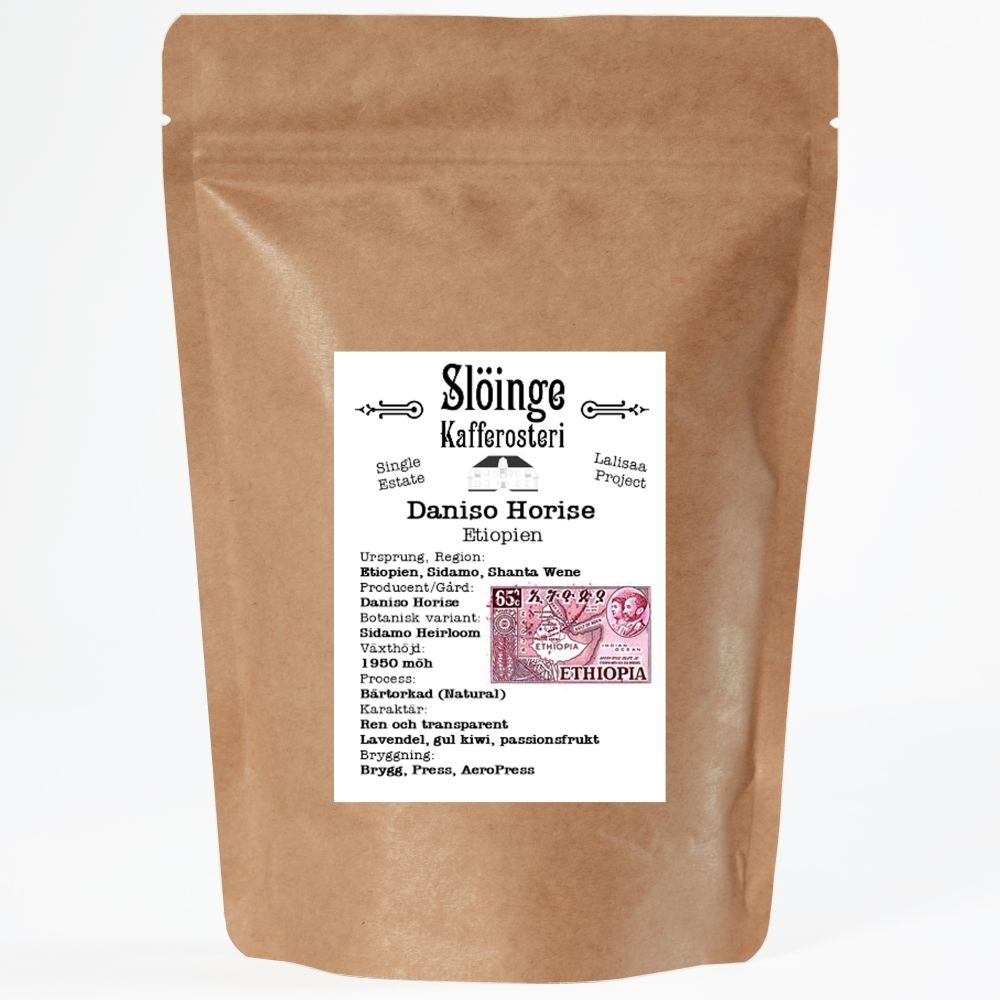 Rostningsdatum 23/9 eller färskare Godast före 23/12 2025Daniso Hariso - EtiopienBotanisk variant: Sidamo HeirloomRegion: Sidamo, Shanta WeneProducent: Daniso HoriseProcess: Bärtorkat (Natural)Växthöjd: 1950 möhEtt single estate-kaffe från Etiopien hör kanske inte till vanligheterna, men det börjar bli lite vanligare vilket vi tycker är kul och vill uppmuntra. Sucafina driver ett projekt som heter Lalisaa där de hjälper enskilda kaffebönder att få ut sitt kaffe direkt till rosterier. Med hjälp av Sucafina och Lalisaa-projektet använder Daniso smarta odlingsknep för att få fram riktigt bra kaffe och samtidigt tänka på både miljön och kvaliteten på bönorna. Gården har gått i arv i 16 år och nu driver Daniso den ihop med familjen. Teknikerna som används är allt från beskärning och föryngring till att plantera nya buskar. Med åren har han hela tiden vässat sina metoder och är snabb med att testa nya tips för att få ännu bättre kaffe och större skörd.Daniso har planer på att utöka odlingen med fler plantor och vill testa kompostering för att göra jorden ännu bättre och hålla produktionen hållbar. Genom Lalisaa-projektet får han mycket stöd av Sucafina Ethiopia – utbildningar där han lär sig nya sätt att odla, skörda och ta hand om bönorna. Hans mål är att få ut sitt kaffe på bättre marknader och på så sätt öka avkastningen, och projektet hjälper verkligen småbönder som honom genom att göra kedjan kortare, höja kvaliteten och öka skörden.Hela familjen hjälper till – de plockar bara mogna, röda bär för hand och torkar dem på upphöjda bäddar. Bären vänds ofta så de torkar jämnt, vilket brukar ta mellan 15 och 22 dagar.Resultatet? Ett kaffe som är riktigt rent och transparent med tydliga toner av lavendel, gul kiwi och passionsfrukt.Namnet Daniso Horise är faktiskt lite oklart (som så mycket i Etiopien). Det är en direktöversättning från hur han själv uttalar sitt namn och det förekommer lite olika stavningar.Koppningsanteckningar:”Ren och transparent.Lavendel, gul kiwi, passionsfrukt.”