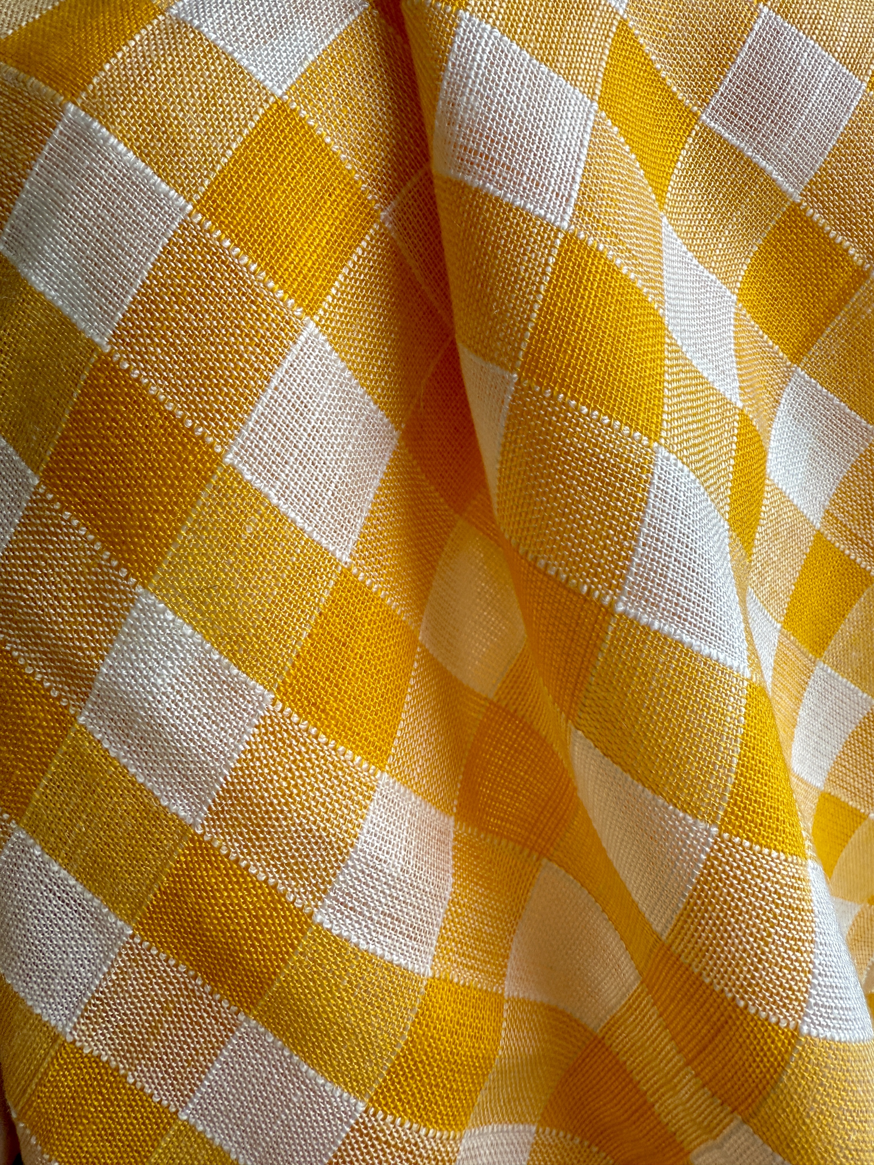 Vintagetyg - Jättefint tyg med gul-vita rutor. Bredd 105 cm och längd 1,15 m. Vintagetyg. Fina rutor i tunt mjukt tyg, aningen transparent. Klargult och vitt.Priset är för hela biten.Kvalitet: Polyester/bomull - troligastBredd: 105 cm.Längd: 1,15 meterTidsperiod: Okänt.Skick: Perfekt, helt oanvänt.