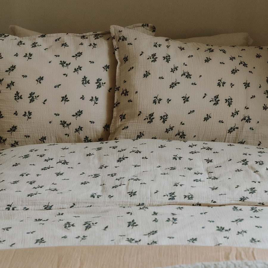 Ett ljuvligt bäddset designat av Svenska Garbo & Friends. Bäddsetet är tillverkat i den mjukaste bommullsmuslin som bara blir mjukare och mjukare efter varje tvätt.Vit botten med ett mönster av små blåbärskvistar och blåbär, bäddsetet stängs med knappar i nederkant.Passar vuxensängMått: 150x210 örngott 50x60cmMaterial: 100% BomullsmuslinTillverkad i Portugal. Produkten är Oeko-Tex 100-certiferad vilket säkerställer att den är fri från skadliga kemikalier.Tvättas in och ut i 40 grader med liknande färger.Stryk med medelvärme och in och ut.