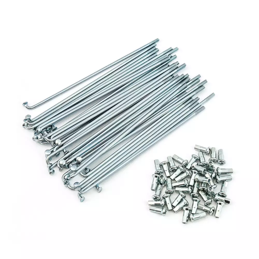 En uppsättning ekrar med en längd på 190 mm.Ekersatsen består av 36 stycken elektrogalvaniserade ekrar med en tjocklek på 2,9 mm och en vinkel på 90°.Setet innehåller även 36 stycken elektrogalvaniserade nipplar som passar ekrarna.Specifikationer – Se ritning:A = 190 mmB = 2,9 mmC = 11 mmD = 90 graderE = 7,5 mmF = 5 mmG = 15 mm För mått kolla denna länk