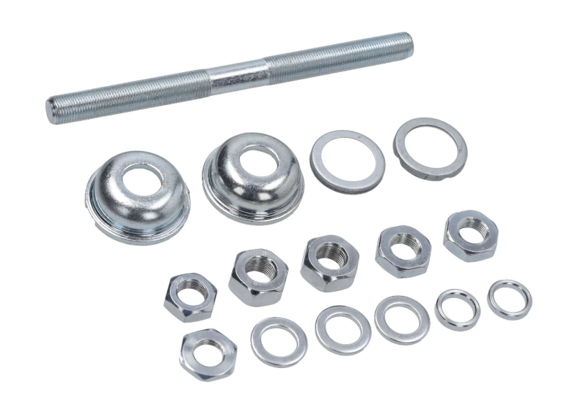 Axel M11x1, längd 145mm, lagerskål ø32mm, fläns dito ø37,5mm. Köp till lagerkulor 11997, 20st åtgår per axel.På bilden saknas konor till axeln men de ingår i satsen.