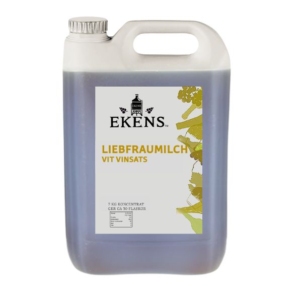 Ekens Vinsats ger dig upp till 30 flaskor som efter 3-4 veckor är färdigt att buteljera. Ett prisvärt och lätttillverkat kvalitéts vin från Ekens.Ekens Liebfraumilch Vinsats är ett sött och fruktigt vin, med söt och krämig smak av päron.Tips för tillverkning och lagring:Vinet kan drickas redan efter 4 veckor, men vinner på lagring. Om vinet jäser ut allt socker och blir för torrt, kan ett halvtorrt eller sött vin skapas genom att extra bryggsocker tillsätts, men först måste jässtopp användas. Om inte jässtopp används kommer vinet jäsa ut det mesta av det tillsatta sockret och det är svårare att uppnå restsötma. Det går även att avbryta jäsningen när vinets sötma anses tillfredställande. Lagras mörkt och svalt.Vinsatsen innehåller:5 liter koncentratVinjästJässtopp (kaliumsorbat E202 och vinsvavla E224)KlarningsmedelInstruktioner