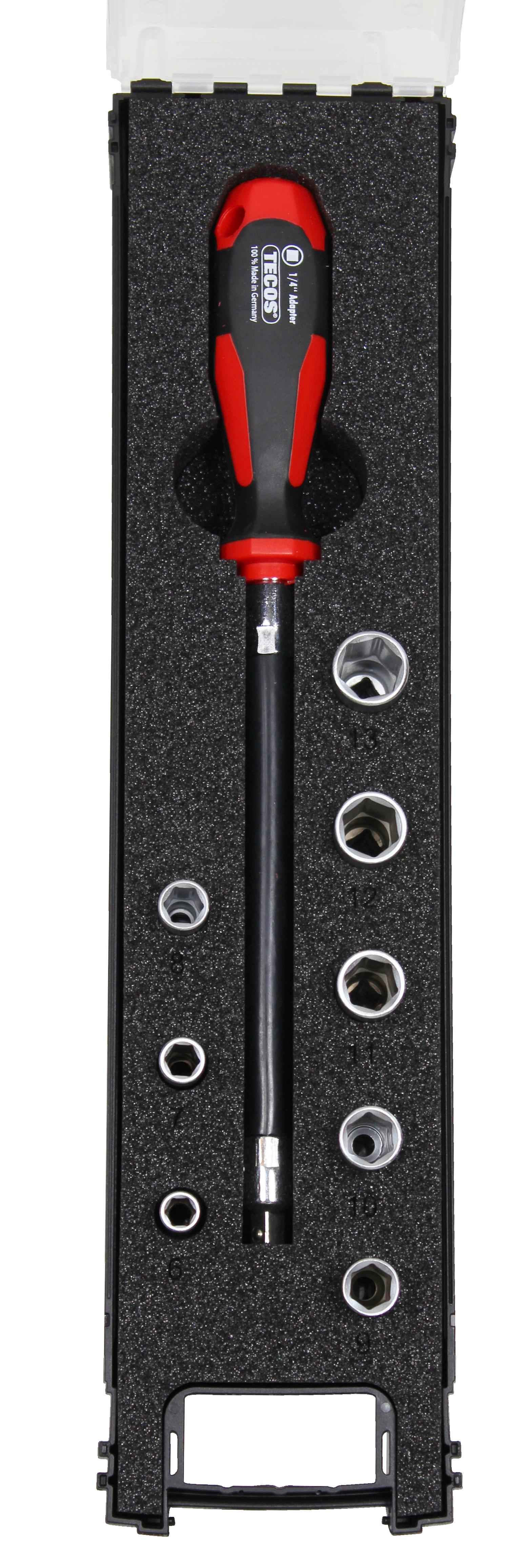 Används vid montering utav vattenblandare. De djupa hylsorna och den flexibla klingan gör det möjligt att komma åt i svåråtkomliga utrymmen.Innehåll: Flexibel skruvmejsel 1/4" hylsfäste8 djupa 1/4" hylsor; 6,7,8,9,10,11,12 och 13Passar de flesta märken på marknaden, bl.a FM Mattsson, Grohe, Oras m.fl.
