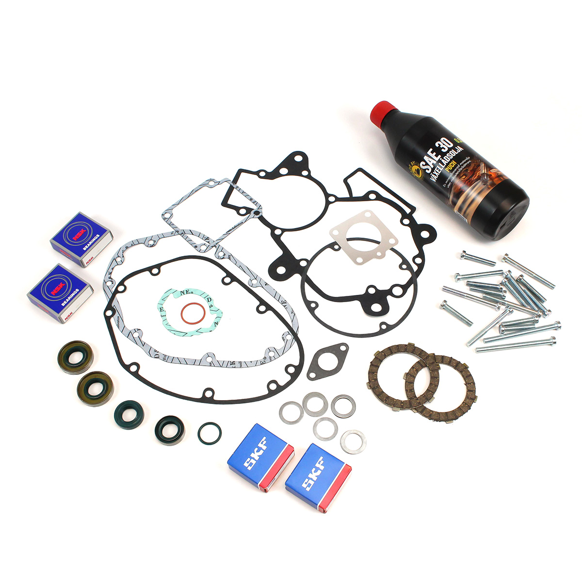 Tips att komplettera med:Lagerrullar 11098Låsringsats 13663Dragbult kopplingVevaxelStålskivor kopplingAtt tänka på, denna sats är för den "kantiga" kopplingskåpan. kontrollera så du inte har kopplingskåpan med de stora styrhylsorna som kom 1984, då behöver du komplettera med kopplingspackning 13487Innehåll:Lager 11941 och 10228 NSK/SKF 2 av varjePackboxsats 10217Packningssats 10094Olja 29913Lameller 10662Shims 11364Skruvsats 17858
