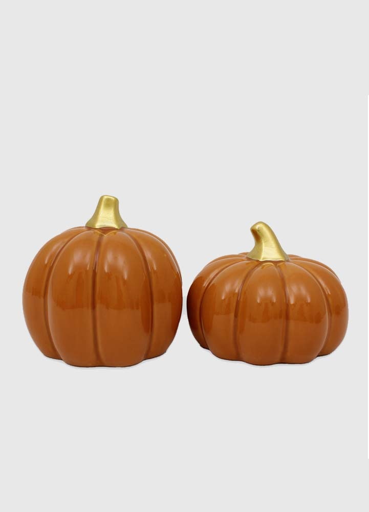 Vackra pumpor i fin ockrafärg med guld på toppen. Fina att använda som dekoration till ett stilleben eller i höstdukningen. Varje pumpa är handgjord och har sin egen unika form och färg, vilket gör dem till ett personligt och unikt inslag i hemmet. Perfekta till höstens dekorationer.Diameter: 10 cm och 8 cmHöjd: 9,2 cm och 10,5 cmMaterial: Keramik