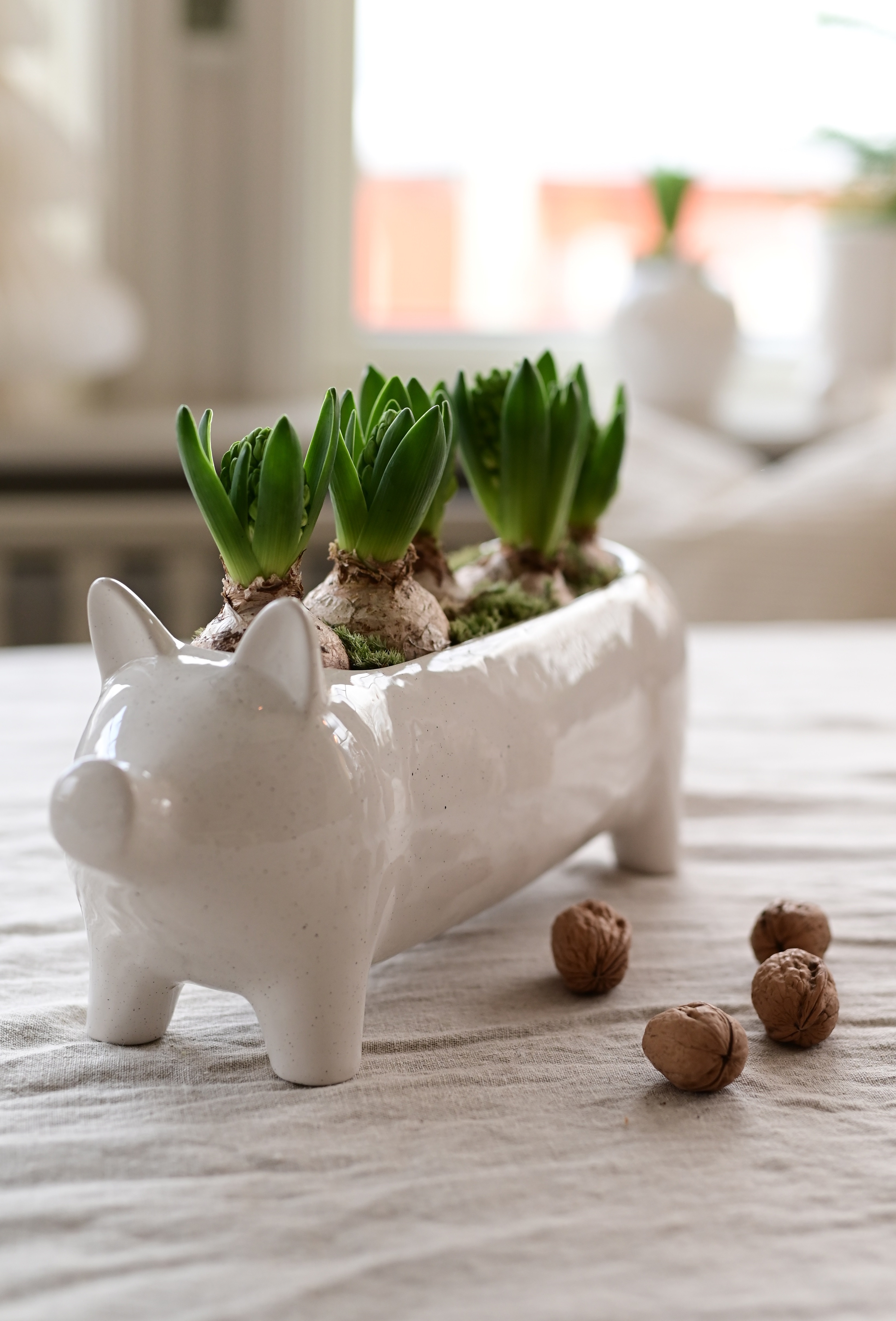 Kruka i form av en söt gris i fin vitmelerad färg. Att sätta hyacinter i till jul ger snabbt en mysig julstämning.40x11x16 cm Ø: 27 cmMaterial: Dolomit