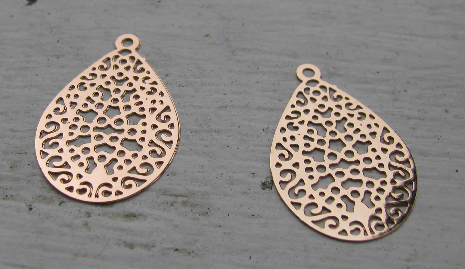 Två vackra hängen av Europeisk kvalitetsmetall. Denna modellen är lite tunnare och väldigt detaljerad.Roséguldfärgad.Mått: ca 24 x 16 mmHål ca 1 mm Tillverkad i Grekland.