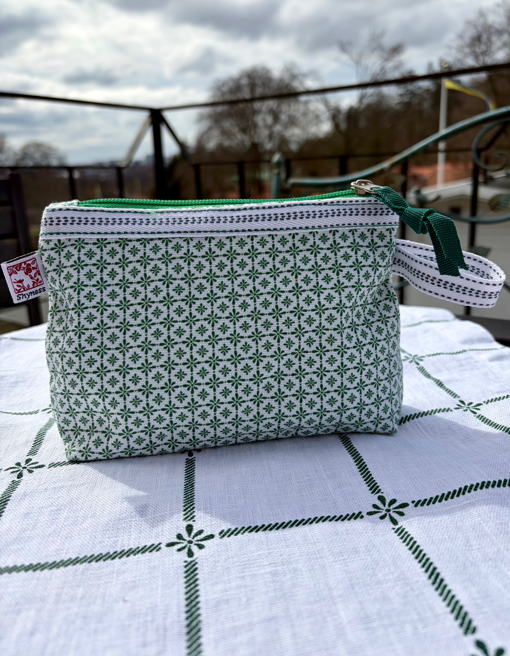 Sminkväska med hängare på ena sidan. Insida med grönt foder och två fickor varav den ena har dragkedja. Yttermaterialet har en vattenavvisande behandling.Storlek: Bredd 18 cm / Höjd 12 cm Material: Yttertyg 100% bomull med vattenavvisande behandling. Foder: 100% nylon.