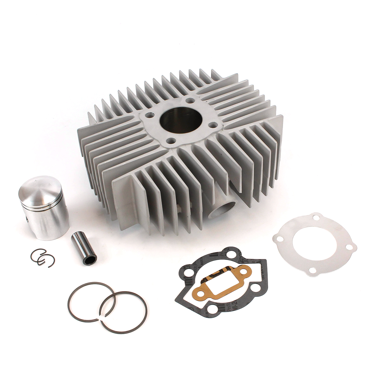 This 40mm cylinder kit fits Kreidler 2- and 3-speed as well as 4- and 5-speed engines with the small 45mm bolt spacing. It’s a high-quality reproduction of the legendary 6.5 HP Kreidler cylinder, original spare part no.: 15.43.97.The kit includes a 40mm aluminum cylinder, 40mm piston, piston rings, 14mm wrist pin, circlips, and gaskets for the cylinder head, base, and intake. The cylinder features two transfer ports, one exhaust port, and one intake port.