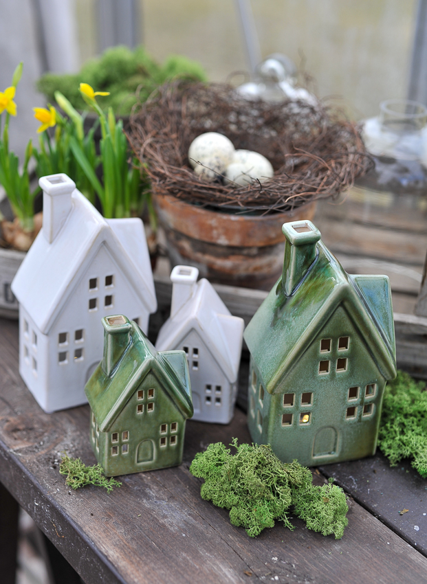 Fint hus av vackert glaserat porslin i en fin grönmelerad nyans. Sprider ett stämningsfullt ljus i fönstret eller på hyllan med den inbyggda LED-lampan med varmvitt sken som lyser vackert genom fönstren. Finns även i större storlek, fint att kombinera några stycken tillsammans som en liten by. En knapp finns på undersidan för att tända & släcka. Batterier ingår. Dessa hus är unika och har en vacker reaktiv glasering. Det innebär att olika glasyrer blandas för hand och tillsammans reagerar när de bränns på de extremt höga temperaturer som keramik kräver. Detta ger ett vackert resultat i subtilt skiftande färgvariationer och effekter som gör varje föremål unikt. Det finns inte två som är exakt lika.Höjd: 14 cmBredd: 6,5 cmDjup: 6,5 cmFärg: Grönmelerad