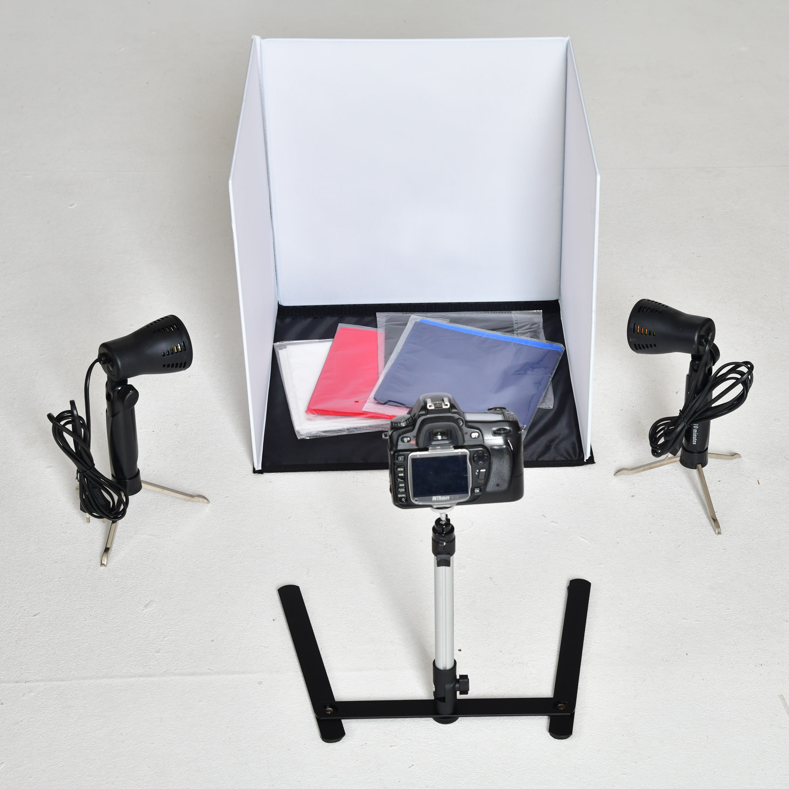 Näst intill nyskick, aldrig använd 40x40x40 cm med olika bakgrundsfärger enligt bild. Kameran på bild ingår ej.