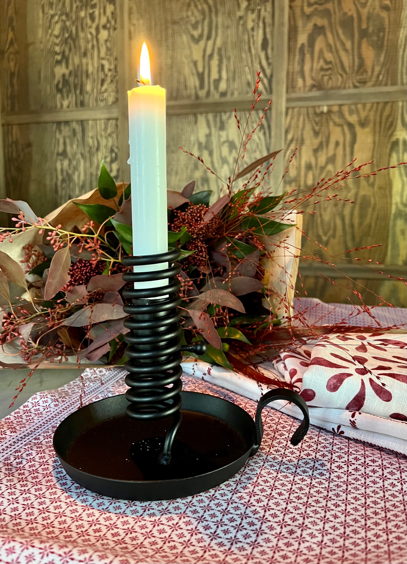 Klassisk stumpljusstake där ljuset kan justeras ned med reglaget i spiralen – så att inget ljus går till spillo. Handgjord i svart smide för en tidlös känsla.Höjd: 13 cm.Tillverkad i Polen av Spegels Hemslöjd.