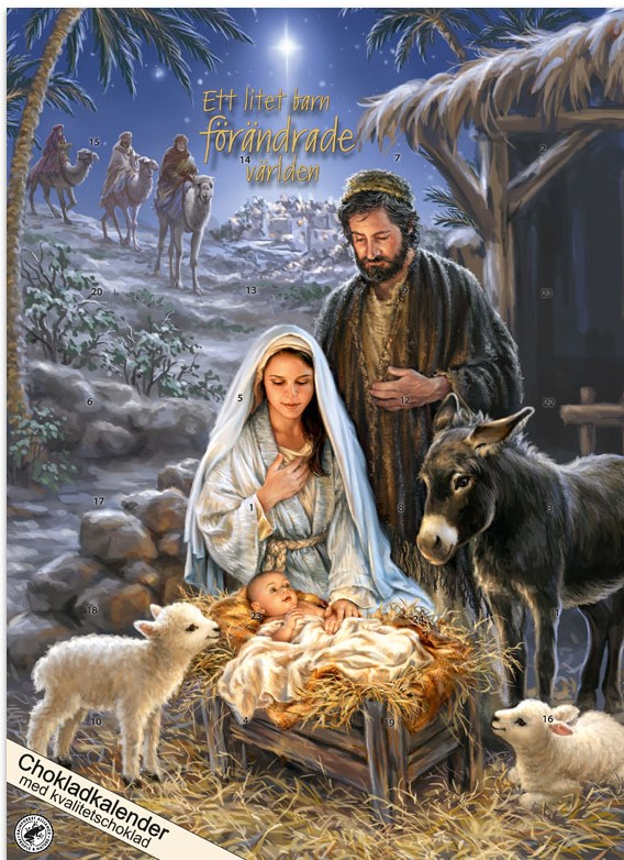 ADVENTSKALENDER MED CHOKLADChokladkalender med en liten mjölkchoklad av hög kvalitet varje dag.Motiv: Julkrubban. Storlek: 35 x 25 cm.