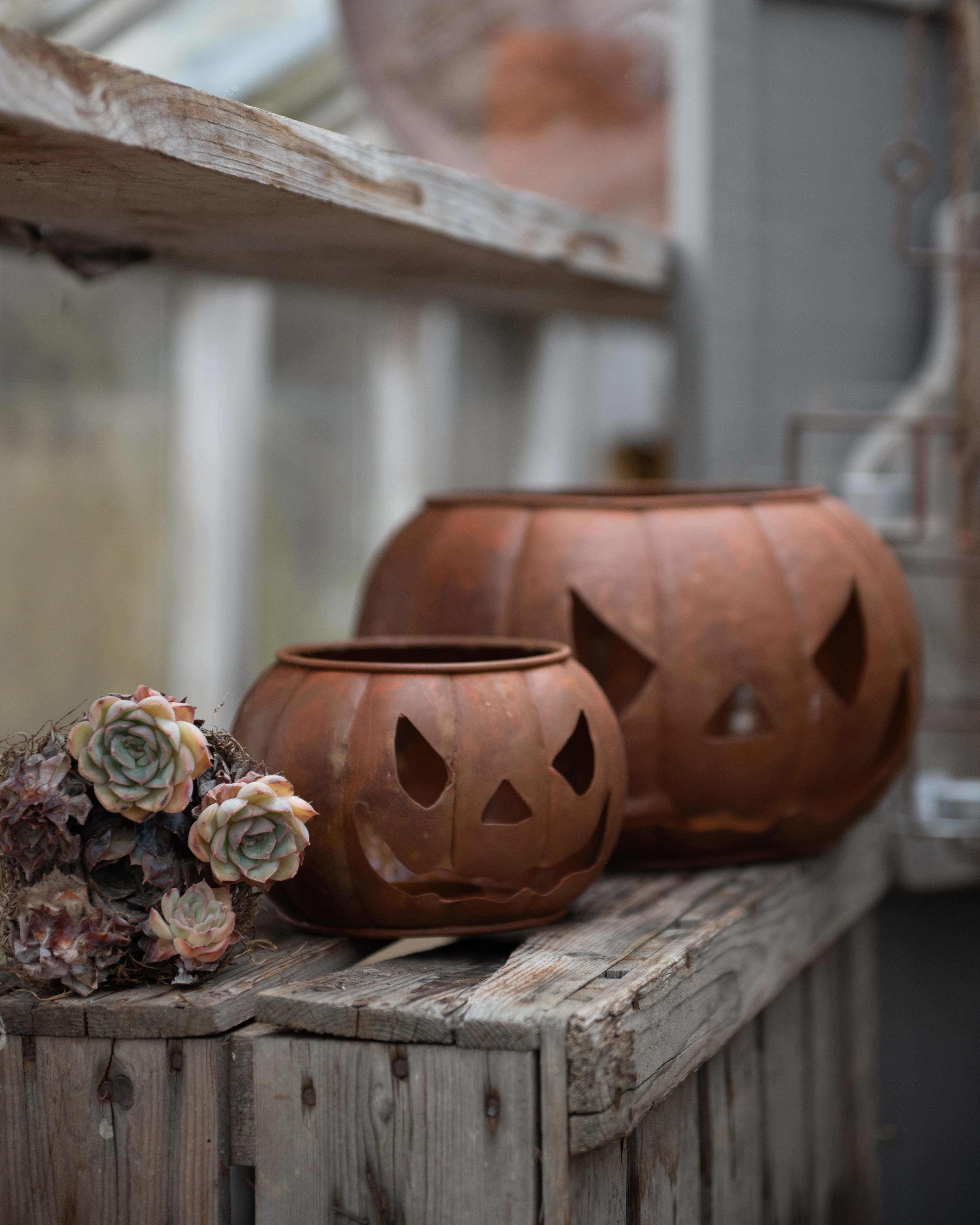 Lys upp trädgården och hälsa gästerna välkomna med denna fina pumpan som ger en härlig höststämning. Väldigt fin och välkomnande vid entrén när den är tänd. Placera ett blockljus, marschall, värmeljus eller en ljusslinga i pumpan för att skapa ett stämningsfullt sken i höstmörkret. En inredningsdetalj som passar år efter år. Den mindre pumpan på bilden.Mått: 15x10 cmMaterial: MetallFärg: Rost