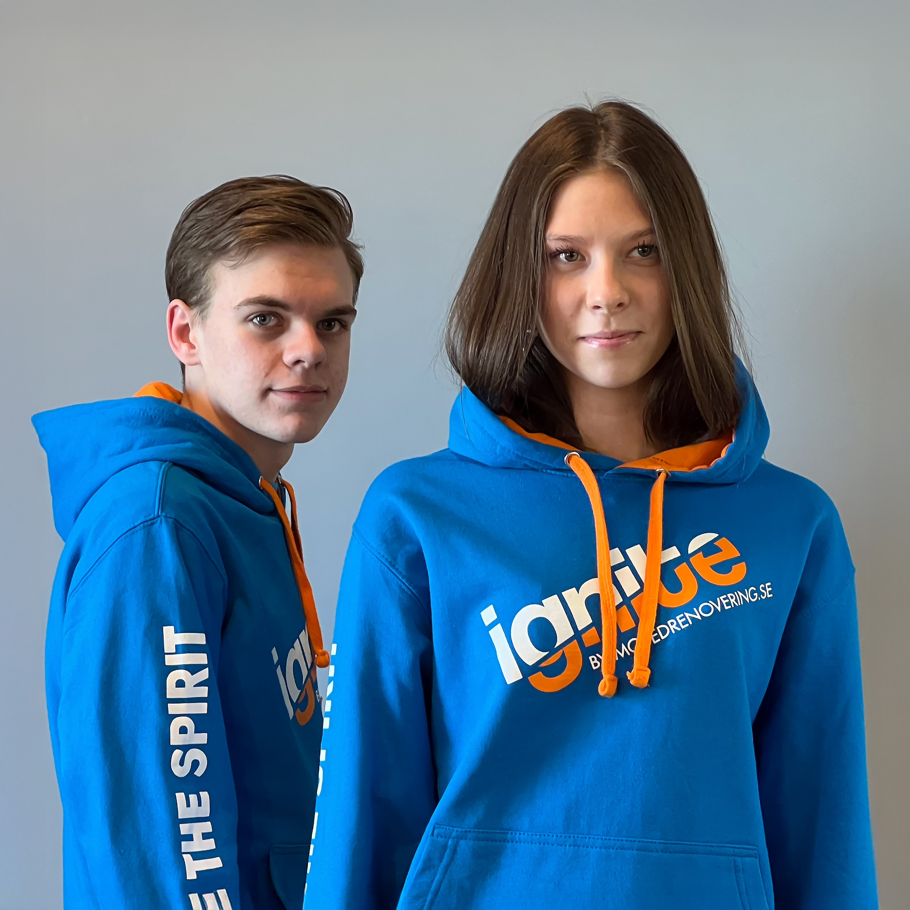 Hoodie IGNITE, unisexEn skön hoodie i unisex-modell med kul kontrastfärg på luvans insida. Tröjan har vår IGNITE-logga på bröstet och texten IGNITE THE SPIRIT på ärmarna. Den har ruggad insida och är tillverkad i 80% bomull och 20% polyester. Tröjan finns i tre färger: - Svart med safirblått tryck o luva- Ljusgrå med safirblått tryck o luva- Safirblå med orange tryck o luvaStorlekar: S, M, L och XL