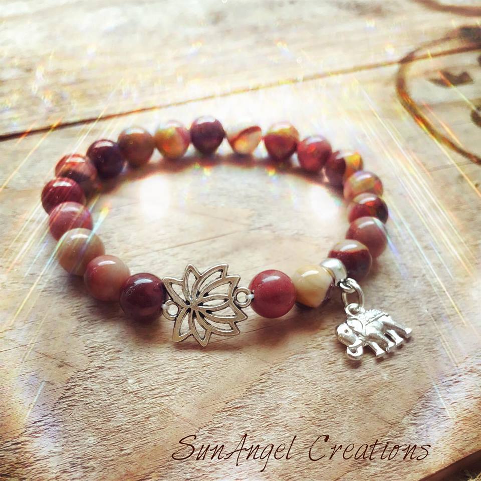 Elastiskt armband gjort av kraftfulla mokait! På armbandet hänger även totemdjuret elefanten.Mokait symboliserar kontakten mellan din kropp och ditt intellekt. Den sägs stärka ditt förhållande till din kropp och dess behov. Mokait sägs också hjälpa dig att vara ståndaktig envis och öppen för din kropps signaler. Dess krafter av healing och andlighet. Den kallas ofta Gaias sten och symboliserar behovet av att ta väl hand om vår Moder Jord. Stenen healar på en högst fysisk nivå och påverkar läkning av sår, brännmärken, bristningar och åderbrock på ett positivt sätt. Den reglerar också obalanser i körtlar och matsmältning. Den är också stenen för den som vill anpassa sin vikt efter sina önskemål.Mokait är vandrarens sten som uppskattas av de som reser, campar seglar eller på annat sätt rör sig över jorden. Den förbättrar också kraften hos de som arbetar med slagruta. Den skyddar också mot människor som försöker lura oss eller på annat sätt spelar ett rävspel. Symboliserar kontakten mellan din kropp o ditt intellekt. Den stärker ditt förhållande till din kropp o dess behov. Den hjälper dig att vara ståndaktig envis o öppen för din kropps signaler.Elefanten symboliserar de tämjda krafterna i oss. Den påminner oss om att vi har möjlighet att välja tankar och handlingar och inte behöver vara slavar under våra instinkter och drifter. Elefanten har även stor visdom och kraft, styrka, en krigare, mycket bra minne och luktsinne. Den har stor omsorg om både äldre och yngre. Den helar det feminina framåt och bakåt i generationer. Elefanten sägs bära universum på sin rygg, och är i många länder ansedd som en helig symbol.
