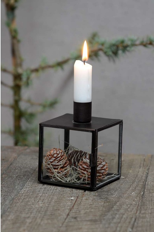 Charmig ljusstake med fin glasbox som lämpar sig väl att dekorera efter säsong! Passar för antikljus. Största modellen på tredje bilden.Material: glas och järnca. 10x10 cm