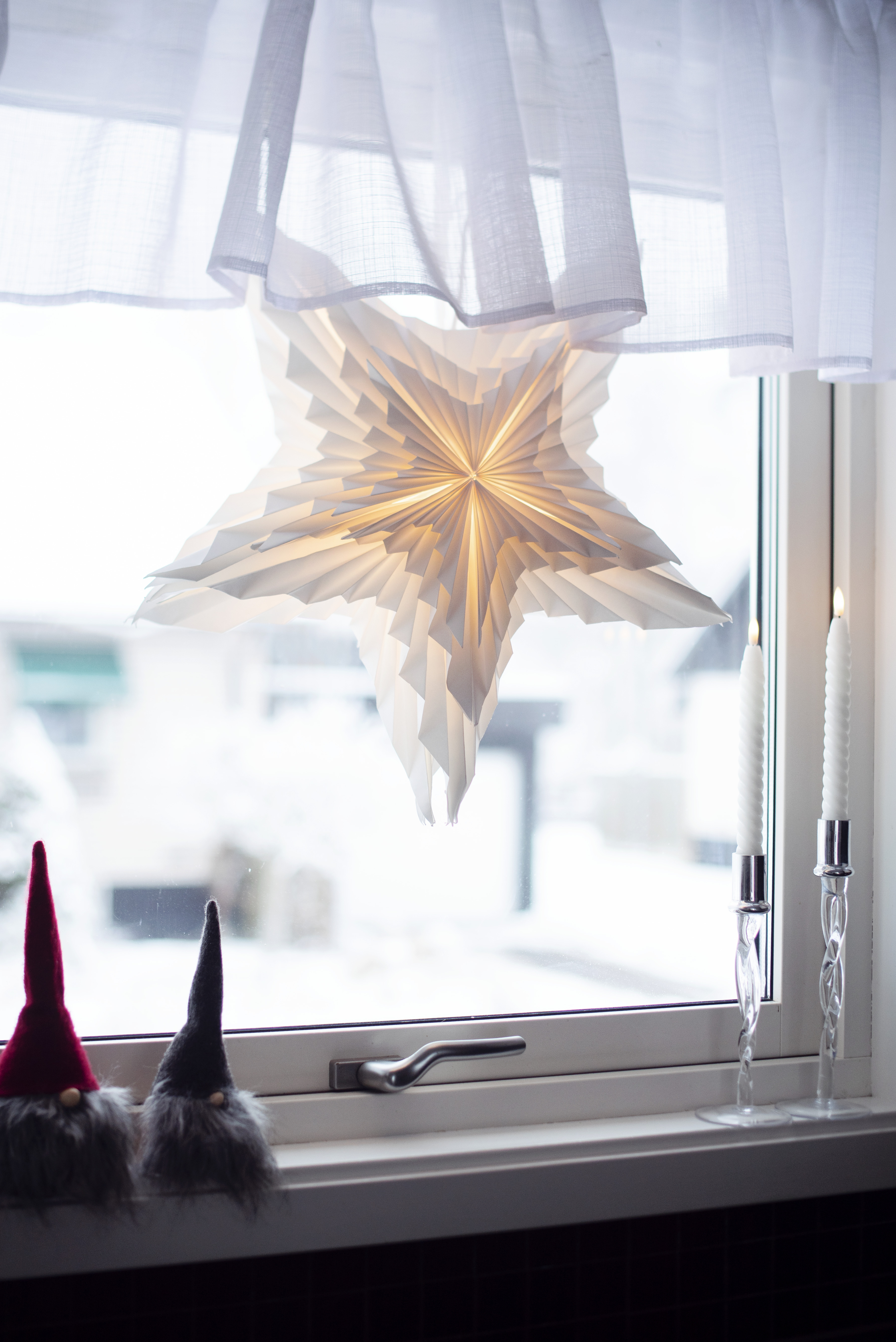 Fantastisk vit pappersstjärna som är tillverkad av tre lager veckat papper. Konturen följer stjärnformen och är lite ojämn för en vintrigare känsla. Ett elegant band ingår för att lättare kunna hänga upp stjärnan. Adventsstjärnan ger hemmet den där speciella julkänslan. Kan hängas både i förnster och mot en vägg. Köp till sladdställ och lampa om man vill ha stjärnan upplyst.Färg VitBredd/längd (cm) 70,00Höjd (cm) 70,00Djup (cm) 18,00Användningsområde InomhusLjuskälla ingår Nej