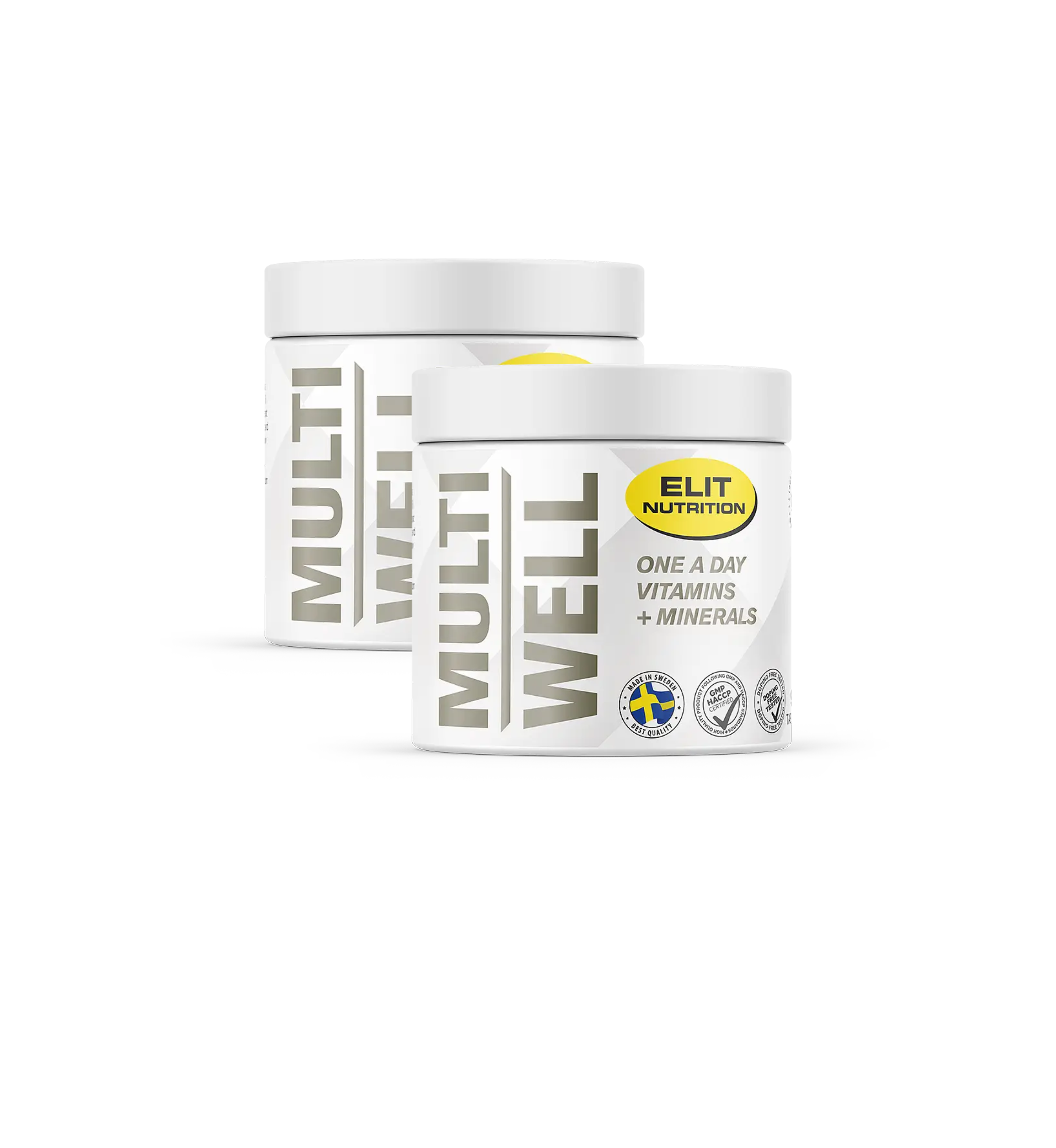 Ditt dagliga näringsbehov i en tablett! En tablett av Multi well innehåller 100% av det rekommenderade dagliga intaget, RDI.För att den mänskliga kroppen ska kunna prestera på sin högsta nivå, är det viktigt att förse den med nödvändiga antioxidanter, vitaminer och mineraler för snabb återhämtning. Genom att ta en tablett av Multi well sammansättningen dagligen, förser man kroppen med alla vitaminer och mineraler som den behöver för ens välbefinnande.Innehåll Per dagsdos %-DRIJod 150 µg 100 %*Järn 9 mg 64 %*Koppar 1 mg 100 %*Krom 40 µg 100 %*Magnesium 250 mg 67 %*Mangan 2 mg 100 %*Selen 60 µg 109 %*Zink 9 mg 90 %*Vitamin A 800 µg RE 100 %*Tiamin 1.1 mg 100 %*Riboflavin 1.4 mg 100 %*Niacin 16 mg NE 100 %*Pantotensyra 6 mg 100 %*Vitamin B6 1.4 mg 100 %*Biotin 50 µg 100 %*Folsyra 200 µg 100 %*Vitamin B12 2.5 µg 100 %*Vitamin C 100 mg 125 %*Vitamin D 5 µg 100 %*Vitamin E 12 mg α-TE 100 %*Vitamin K 25 µg 33 %**Dagligt referensintag (DRI) för en genomsnittlig vuxen (8400 kJ/2000 kcal)Övriga ingredienser: Fyllnadsmedel (mikrokristallin cellulosa), färgämne (titandioxid).Information: Detta är ett kosttillskott och bör ej användas som ett alternativ till en varierad kost. Den rekommenderade dagliga dosen bör ej överskridas. Förvaras oåtkomligt för små barn. Tänk på vikten av en mångsidig och balanserad kost och en hälsosam livsstil. Produkten är avsedd för friska personer över 18 år. Om du är gravid, ammande, lider av sjukdom eller behandlas med läkemedel bör du alltid kontakta läkare innan du använder produkten.