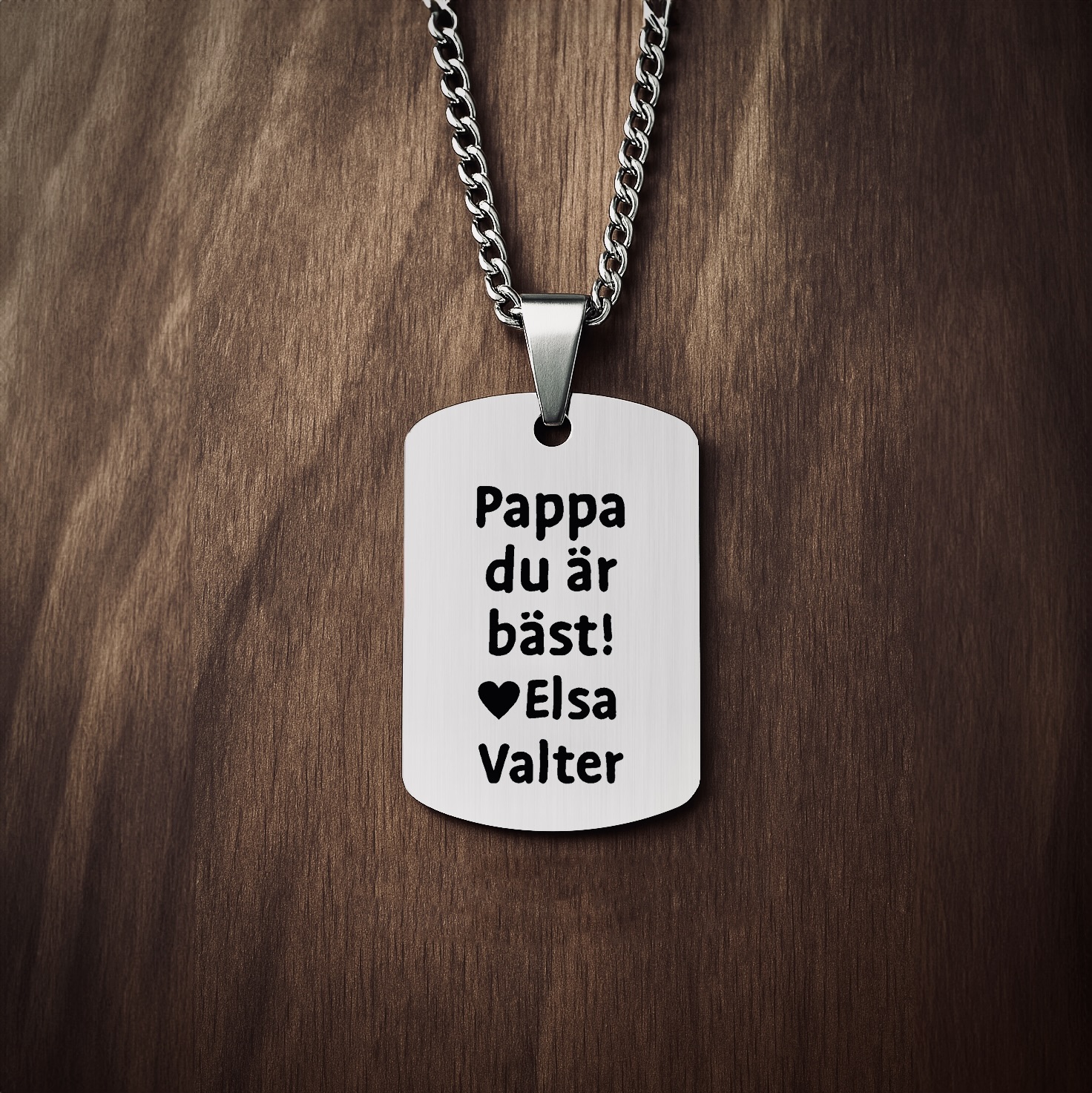 Stilrent halsband med id-bricka. Valfri text ingår. Högst 9 tecken per rad. En bokstav räknas som ett tecken, ett mellanslag räknas som ett tecken, ett hjärta räknas som två tecken. Viktigt om ni vill ha ett hjärta i personliga texten så skriv inom parentes: (hjärta), infoga EJ en hjärt-symbol då text kan försvinna pga en bugg i systemet. Så skriv inom parentes: (hjärta) där hjärtat ska vara & inom parentes (stjärna) om ni vill ha en stjärna graverad i den personliga texten.Bricka mått: 30 x 20 mmMaterial: Rostfritt Stål Lasergravyr: matt svart textAllergivänligt och Nickelsäkert enligt EUs nickeldirektiv.