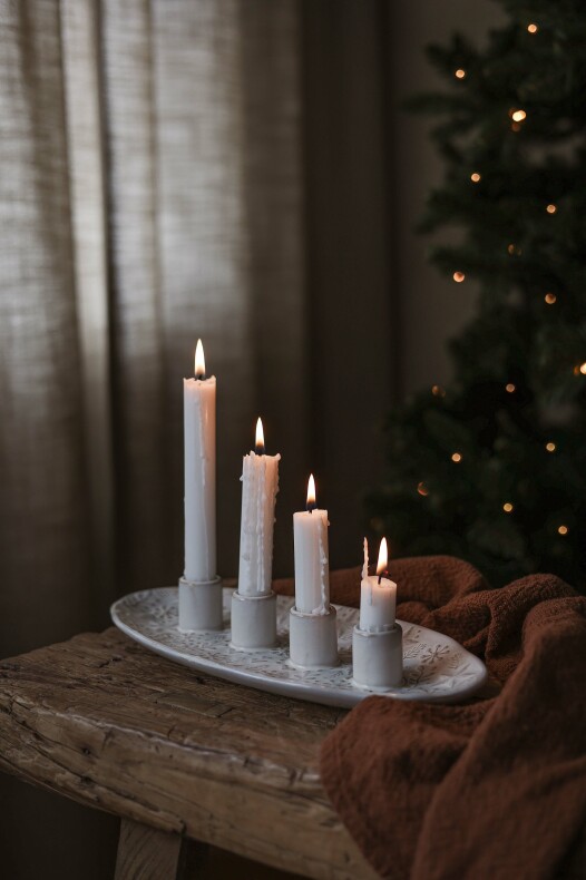 Vacker ljusstake/adventsljusstake med fint vintermönster. Ljusstaken är i stengods och har en handgjord reaktiv vit glasering vilket ger en fin rustik och naturlig känsla. TÅL BÅDE DISKMASKIN OCH MICRO. Varje ljusstake är unik i sitt utseende med mindre variationer i glasyren. Majas Cottage, Säljs med 10% förmån till barncancerfonden. Material: Keramik/StengodsMönster: Granar, kvistar, hjärtan, stjärnor & snöflingor Strl 31 x 15 x 4,8 cm