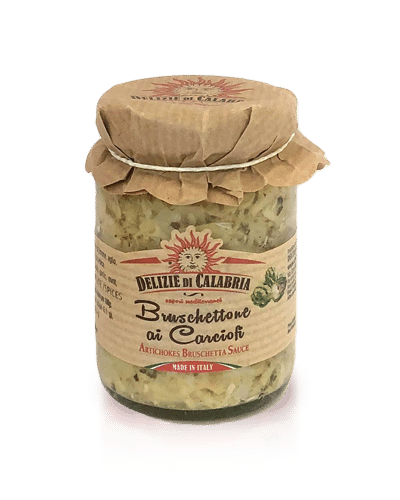 Bruschetta på kronärtskockor från Kalabrien. Perfekt som antipasti med lite bröd och andra trevliga tillbehör. Ingredienser:Kronärtskocka 68%, solrosolja, salt, citronjuice, vitlök, mynta, persilja, svartpeppar, surhetsreglerande medel: citronsyra, antioxidant: askorbinsyra.