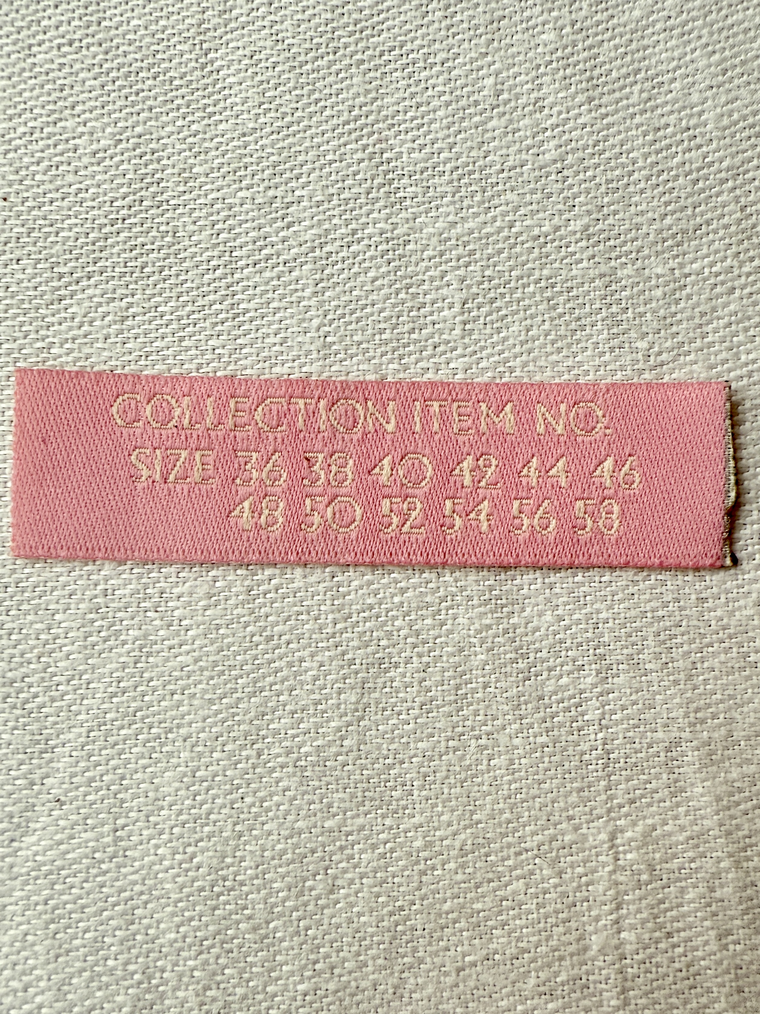 Vävda storleksetiketter med 36-58 på samma band. Rosa med vit text.Vävda etiketter, rosa band med vit text. Fiffig etikett där du själv kan ringa in vilken storlek som gäller men även ett nummer eller beteckning på ditt unika plagg - "Collection item no: "!Varje etikett är 15 mm hög och 60 mm bred. Välj antal. Du kan köpa från 1 st. Finns även med lila band (art nr et2-l-36-58)!Pris per etikett.