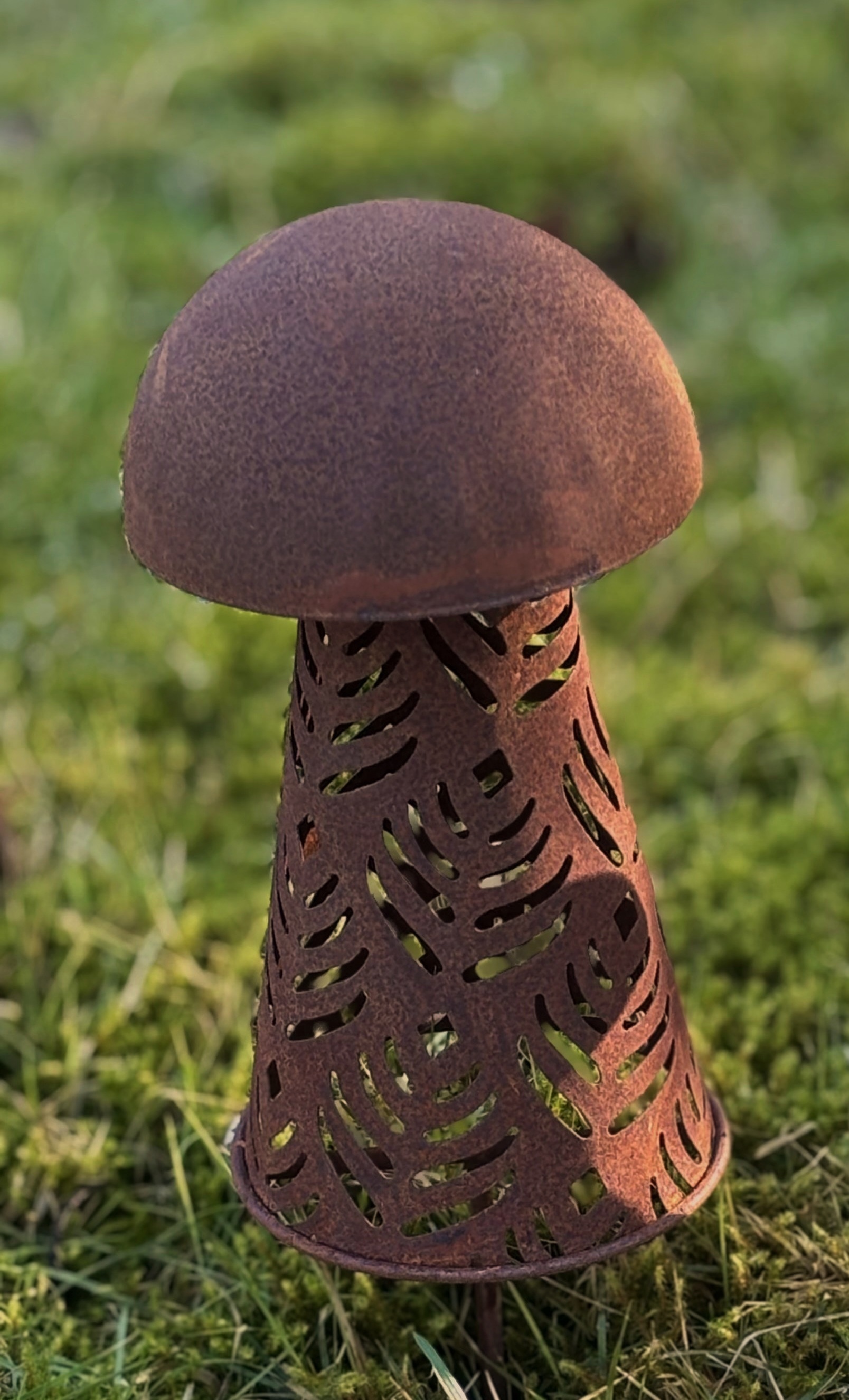 Dekorativ svamp i rostig metall med vacker dekor som ger trädgården en naturlig och lekfull touch. Perfekt i rabatter, på terrassen eller som dekoration på trädgårdsbordet. Även fin att använda som dekoration till ett stilleben. Finns flera storlekar i samma serie så du kan skapa din egna lilla skogsglänta hemma.H: 17 cm x B: 9 cm + 12 cm pinneFärg: rost. Material: Metall
