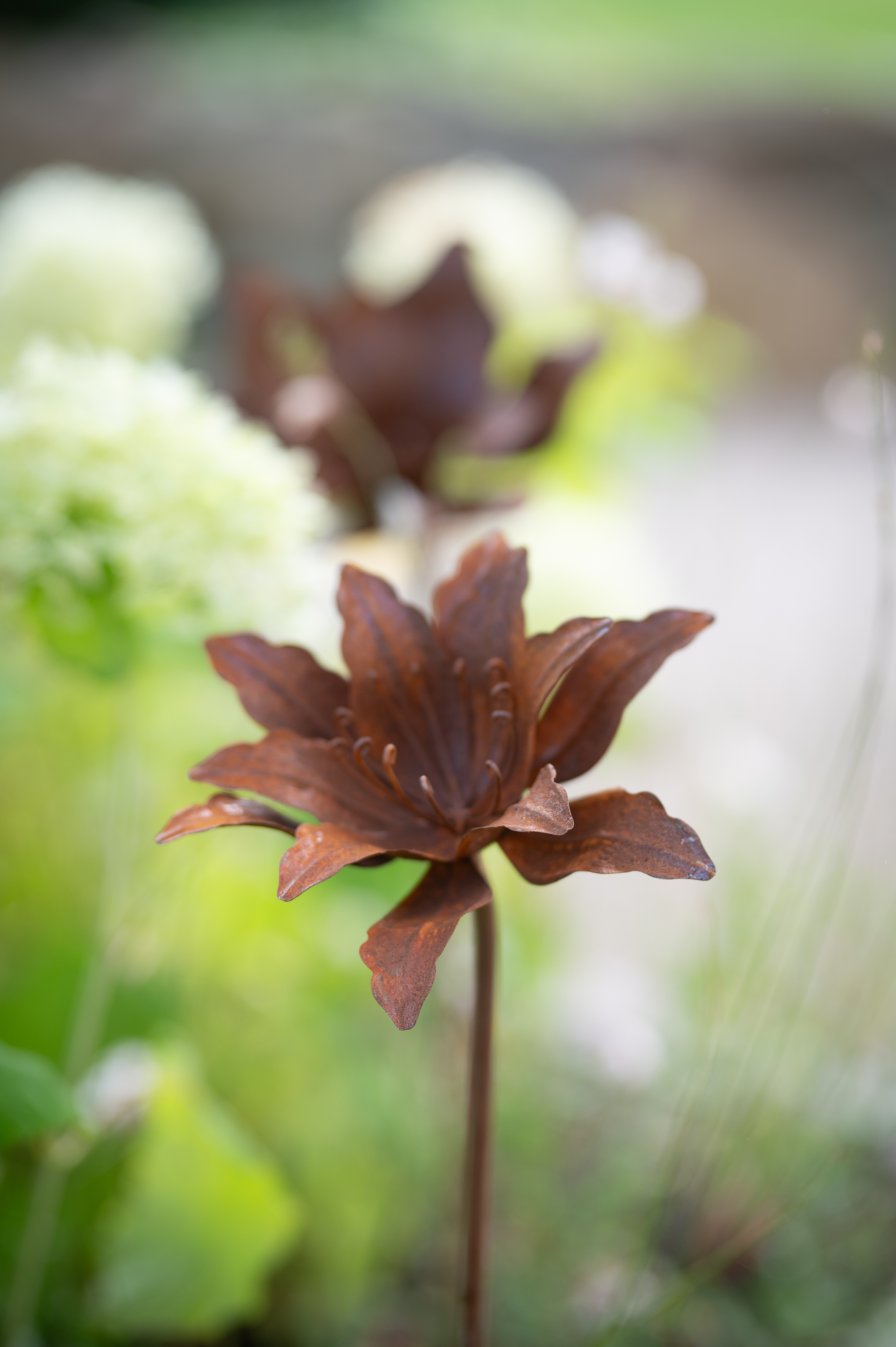 Två vackra sticks/pinnar i järn/metall med fina blommor. Fina att trycka ner i en rabatt eller kruka/urna med vackra blommor. Lika fina inne som ute. Fin enkel och tidlös design. 20x6 cm +80 cm stång Den mindre blomman är något mindre i måtten.Material: Järn/metall