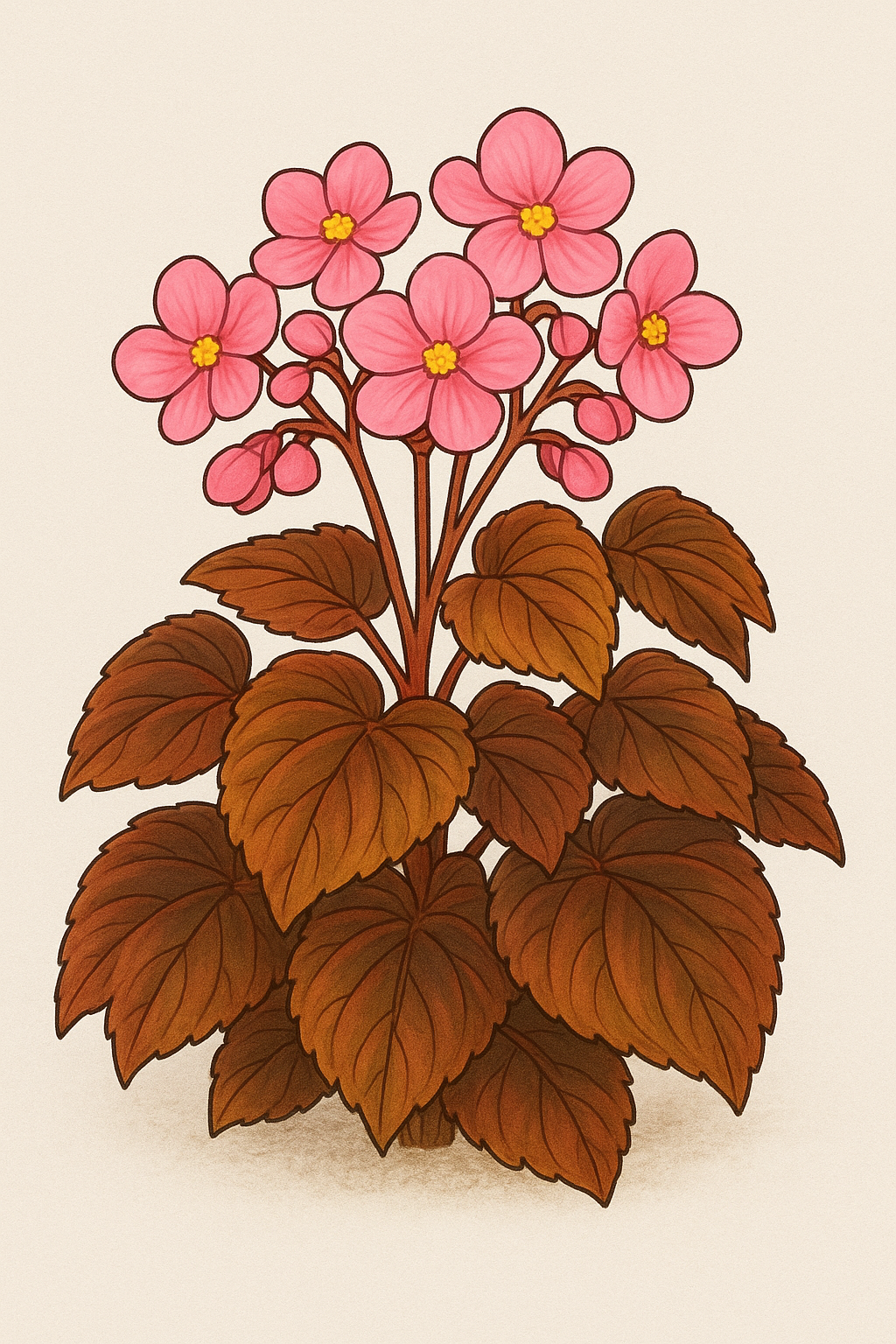 En fantastisk växt med stora rosa blommor och vackert brons-tonade bladEn kompakt, buskig hybridbegonia med glänsande, mörkbronserade blad och stora, rosafärgade blommor som sitter ovanför bladverket. Plantan har en livlig, fyllig form—särskilt vacker i amplar, krukorIllustration; Sneckenström