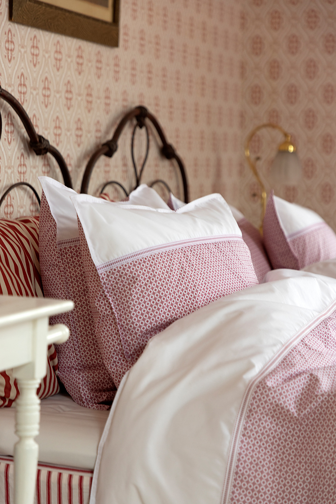 Örngott vävt av 100% långfibrig och kammad bomull, till tätslagen perkal. Shyness perkal-tyg ger en mjukt frasig och sval känsla med hög sovkomfort som bibehålls natt efter natt.Tvåsidigt designat med en helt mönstrad sida och den andra med insydda effekter och mönsterband. Produkten är OEKO-TEX certifierad.Vid öppningen på örngottets kortsida finns ett invikt tyg som döljer innerkudden och dessutom finns tre par dekorationsband.Storlek 50*60 cmMaterial: 100% bomull, perkalTillverkningsland: Lettland