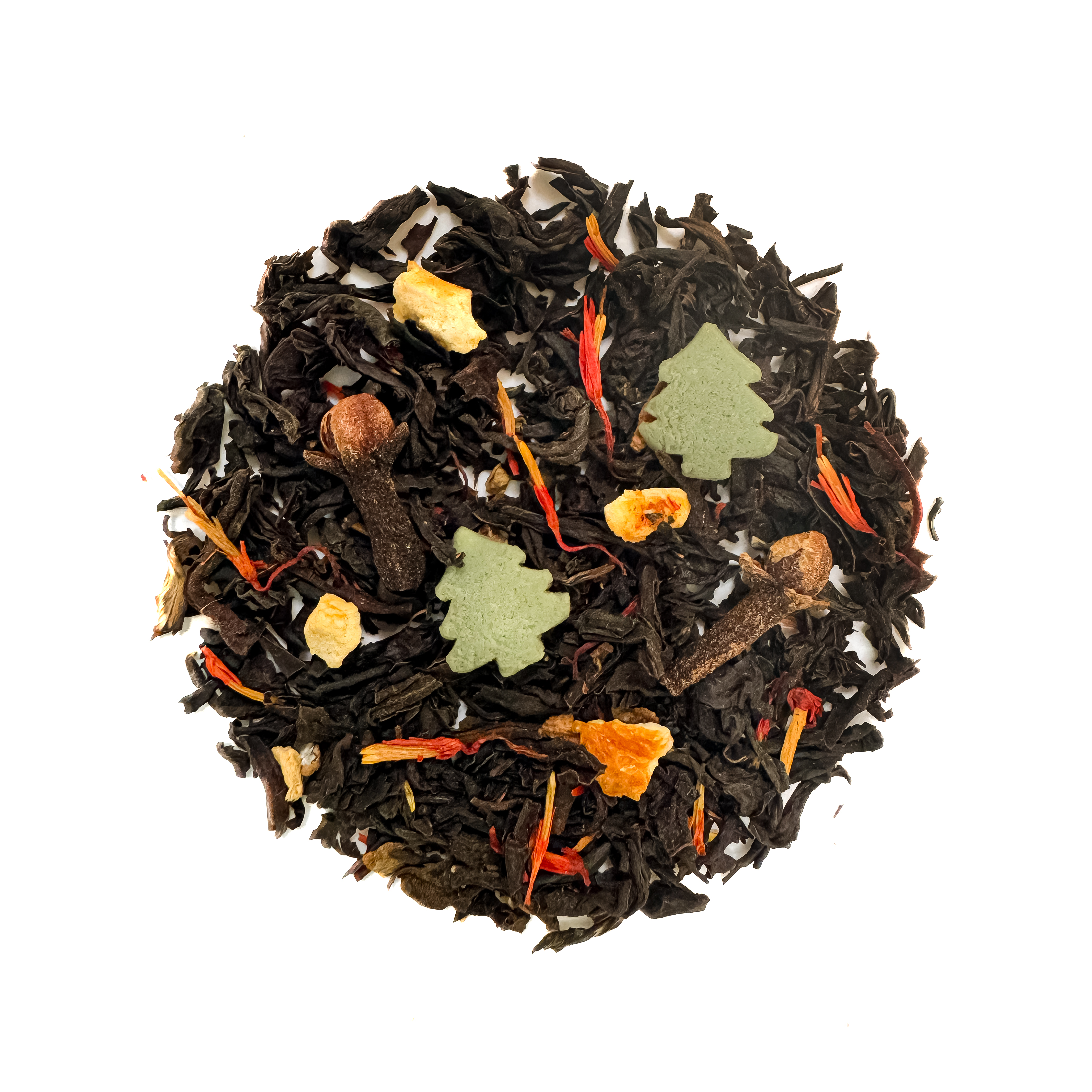 MidvinterSvart te med smak av apelsin, kryddnejlika, kanel och ingefära från Dear Tea Society (Johan & Nyström). Dekorerat med apelsinflingor och sockergranar.