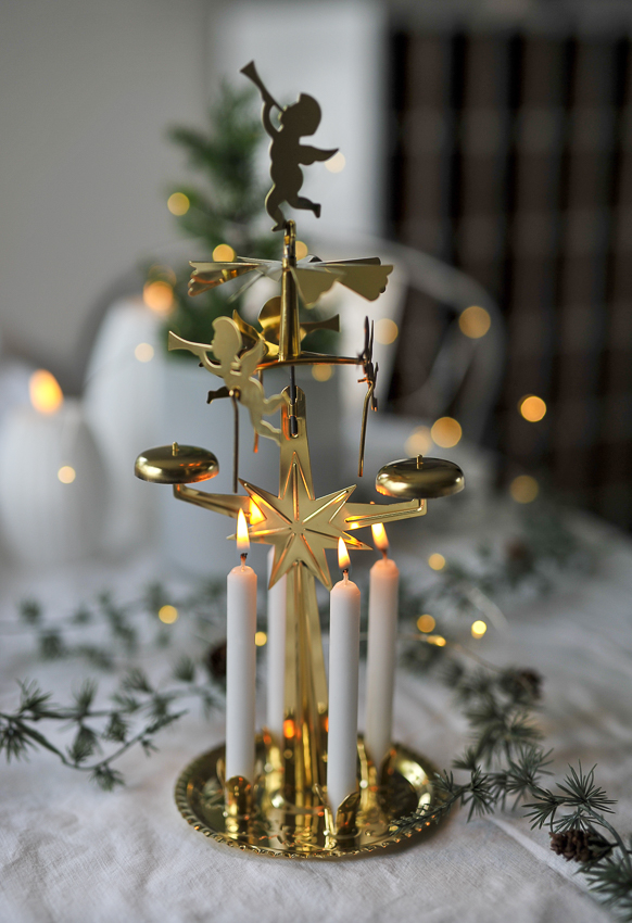 Klassiskt änglaspel - Originalet. Svensk design av Eric Boberg sedan år 1948, då originalet var i mässing. Härlig retrokänsla och nostalgi. När julgransljusen tänds så snurrar änglarna runt och de små klockorna pinglar. 4 st. ljus ingår i förpackningen. Guldpläterad stålStorlek: H=28 cm Bas=12 cm