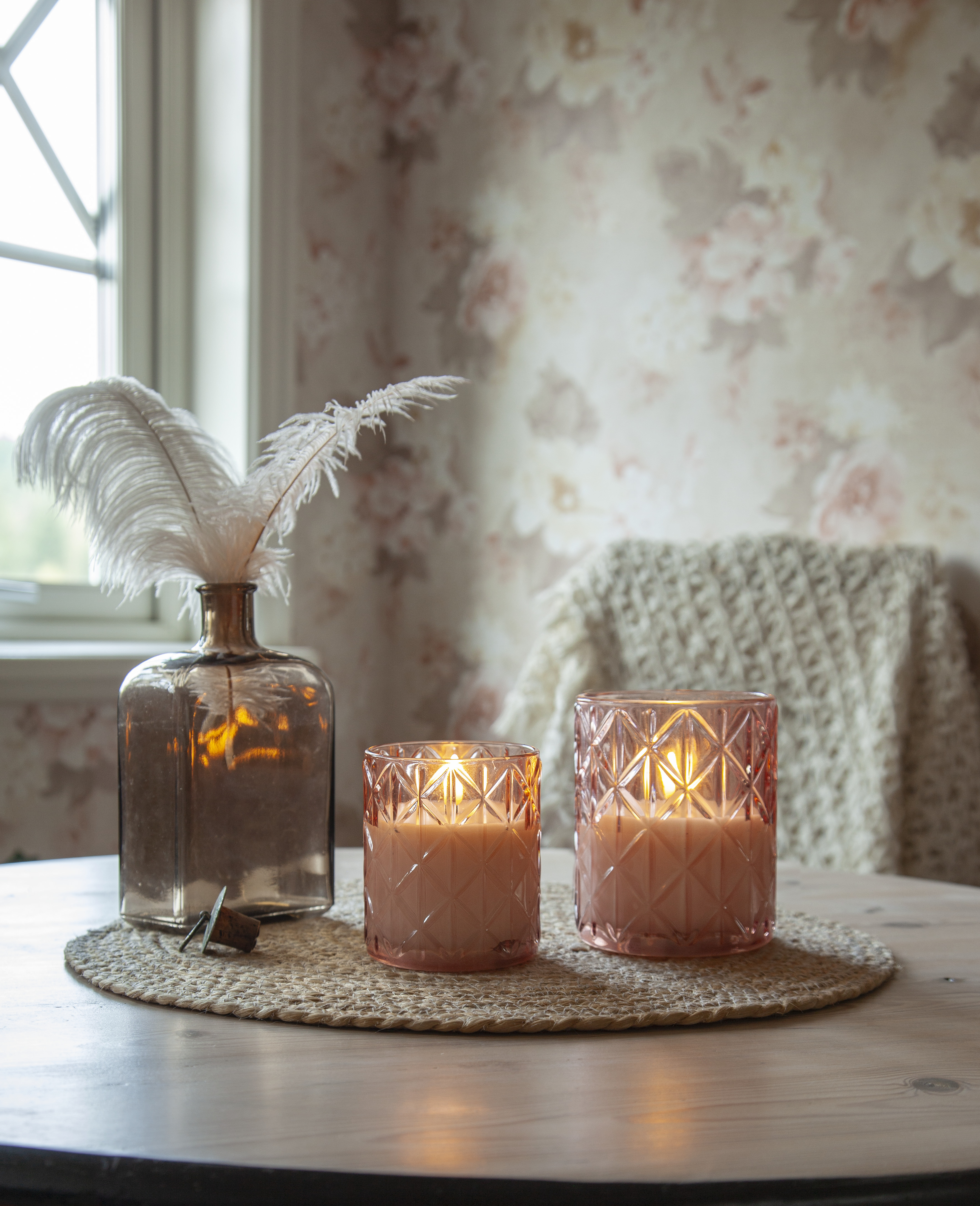 Glaslykta med batteriljus som har ett rombformat mönster runt vaxljuset. Ljuset är cirka 9 x 10 cm. Detta batteriljus blir en vacker dekoration, både ensam och i grupp ihop med övriga batteriljus. Det har timerfunktion och när brytaren är på timerläget lyser ljuset i ca 30 dagar med en vacker realistisk låga i varmvitt. Det drivs av 2 AAA batterier, dessa ingår ej.FärgRosaLjusfärgVarmvitBredd/längd (cm)8,50Höjd (cm)10,00Djup (cm)8,50AnvändningsområdeInomhusLjuskällor1Ljuskälla ingårJaTyp av ljuskällaLEDSockelEj utbytbarBatteriinformation2 batterier AAA ingår ej. Brinntid ca. 200h.Timer6 h på, 18 h av, repeterandeStrömbrytareIntegreradTotal effekt (W)0,02Spänning3V DCIP-klassIP20