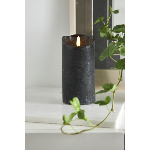 Svart ljus av vax med rustik yta i vår Flamme serie. Den naturtrogna lågan lyser med ett varmvitt sken. Med inbyggd timer.