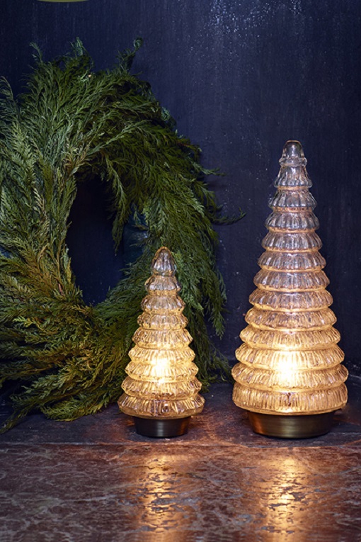 Mysig stor bordslampa i glas med form av en gran. Sprider ett mysigt och stämningsfullt sken. Den större granen på bilden.Höjd: 44 cm Bredd: 18 cm Djup: 18 cmMaterial: Glas, metallFärg: Klar, antikmässingE 27 max: 40W140 cm svart sladd med strömbrytare