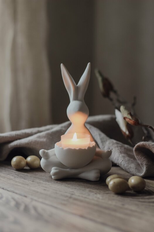 Stilfull kanin/påskhare/yoga bunny i fin matt vit keramik från Majas Cottage. Väldigt dekorativ och fin stilren design, avsedd för värmeljus. Säljs med 10% förmån till Barncancerfonden.Mått: 9x8x15 cm