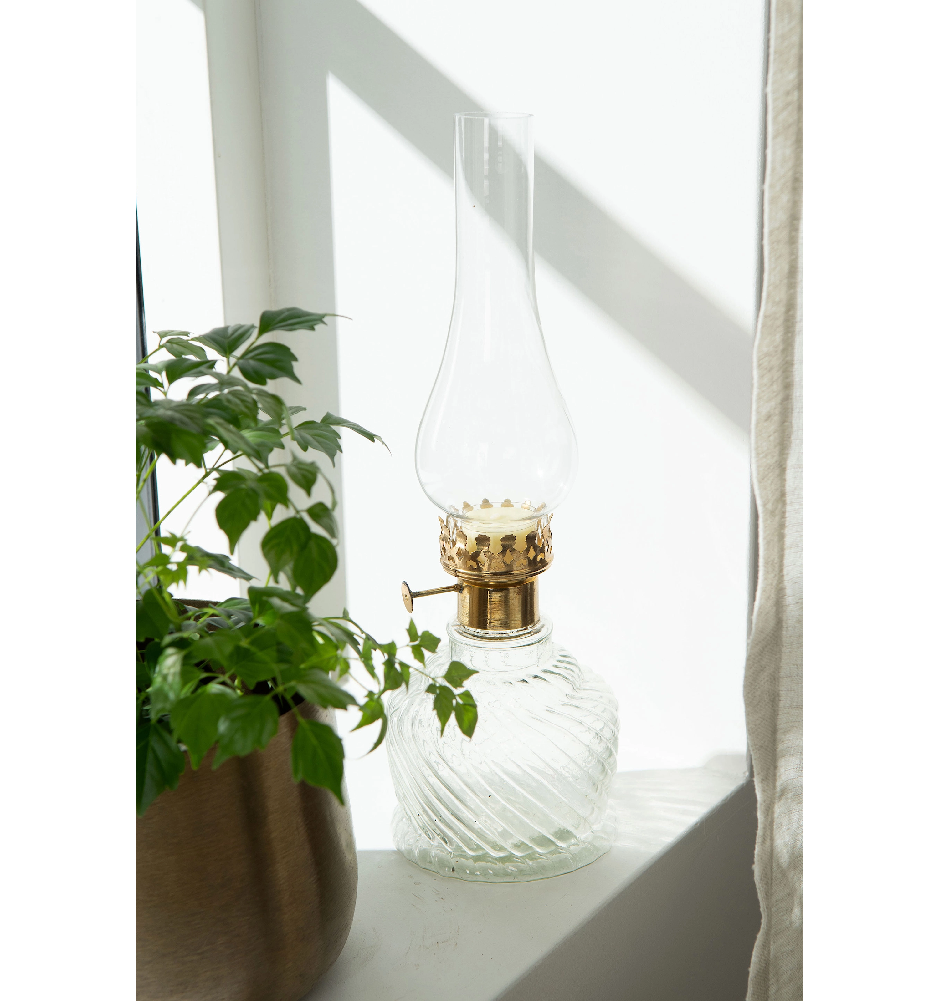 En alldeles bedårande lykta för värmeljus av klart glas med vackert mönster och fina mässingsdetaljer. Höjd: 34 cm Diameter: 12 cmMaterial: Metall & glasFärg: Klar/mässing